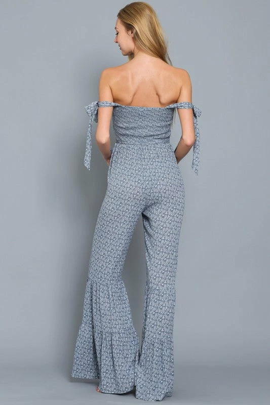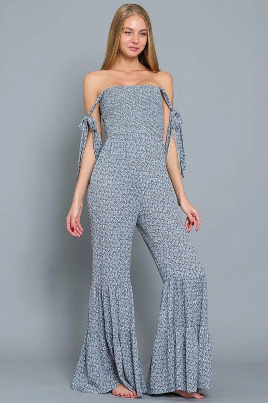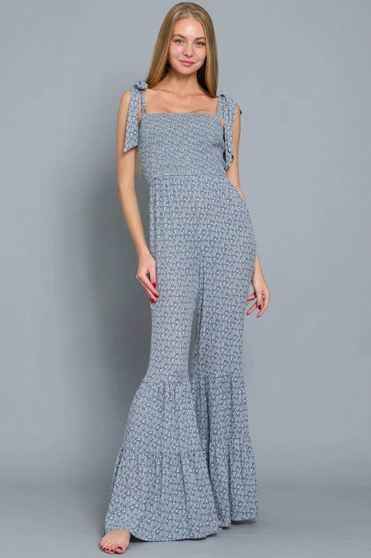TIE SHOULDER STRAP SMOCKED JUMPSUIT. 100% RAYON.