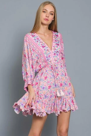 DOLMAN SLEEVE TIE FRONT WAIST RUFFLE HEM BORDER PRINT DETAIL MINI DRESS 100% RAYON.