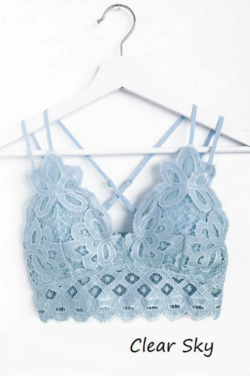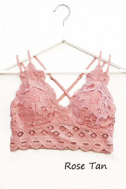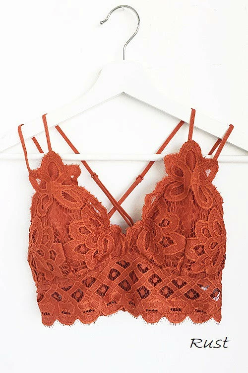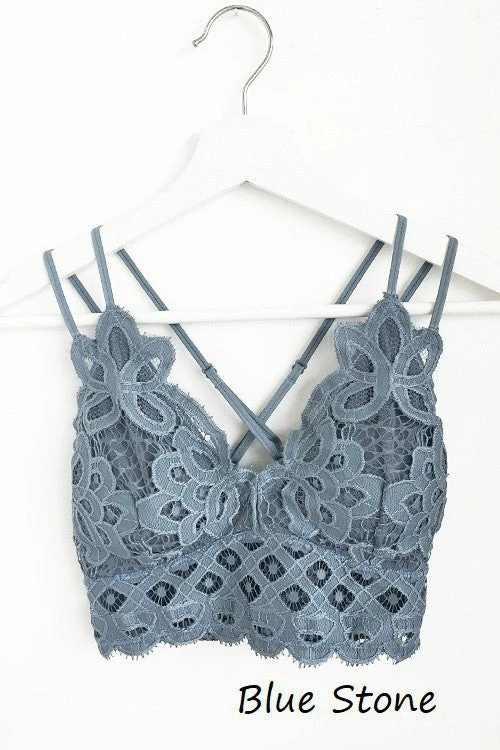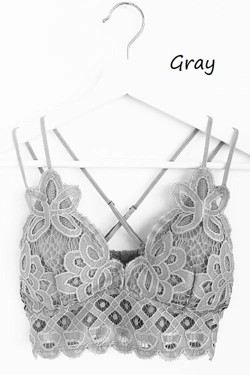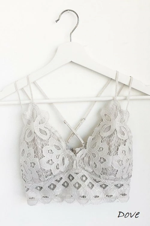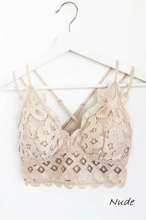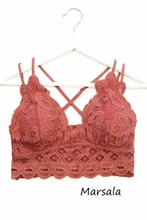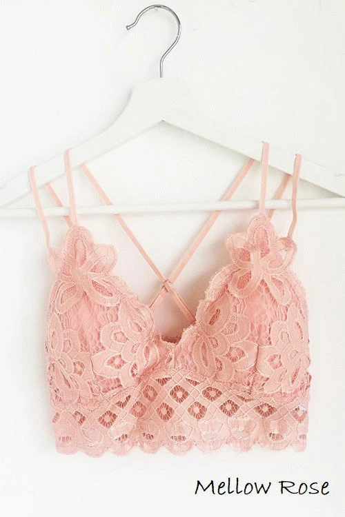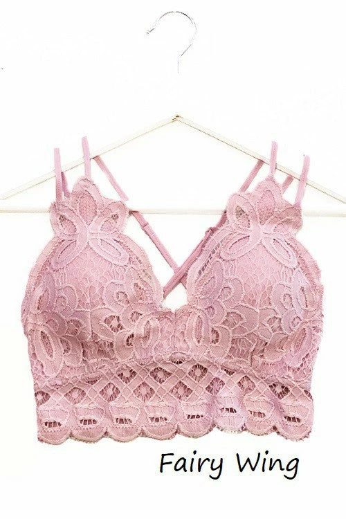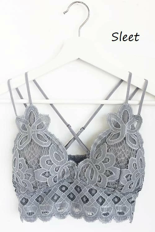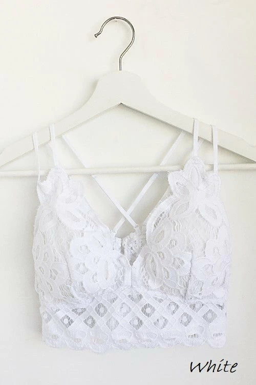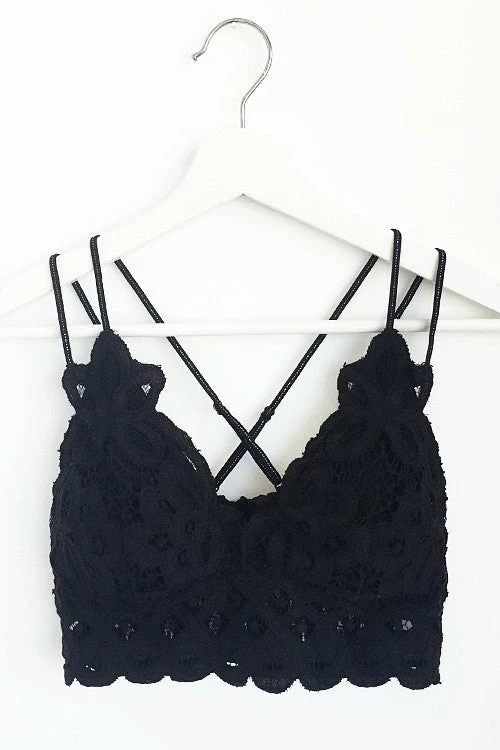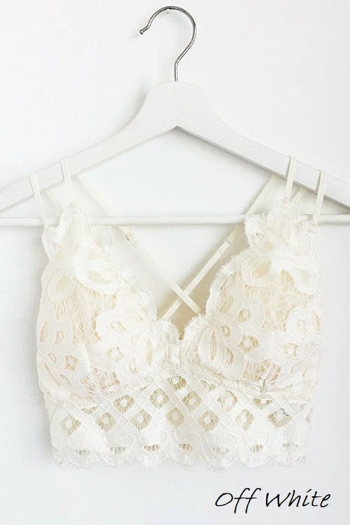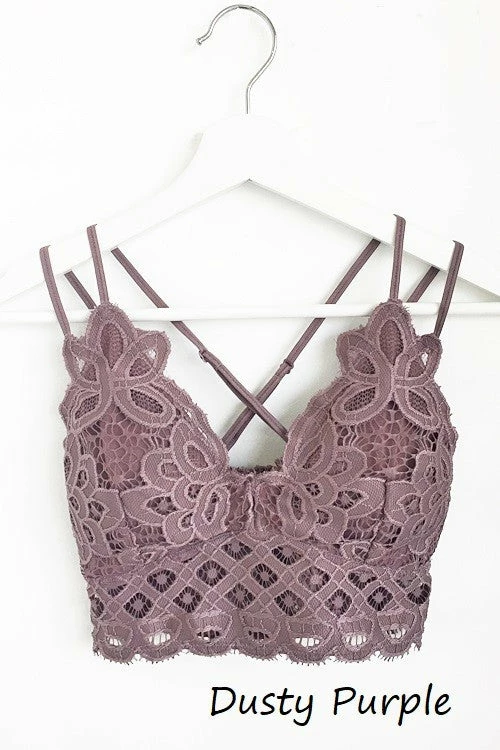 Beautiful crochet lace bralette, pull over style, long line, all day comfort, v neckline, removable bra pads, criss-cross straps at back, adjustable bra straps, and perfect amount of stretch. 90% Nylon, 10% Spandex S: 32B, 34A, 34B M: 34B, 34C, 36B L: 36B, 36C, 38B,38C