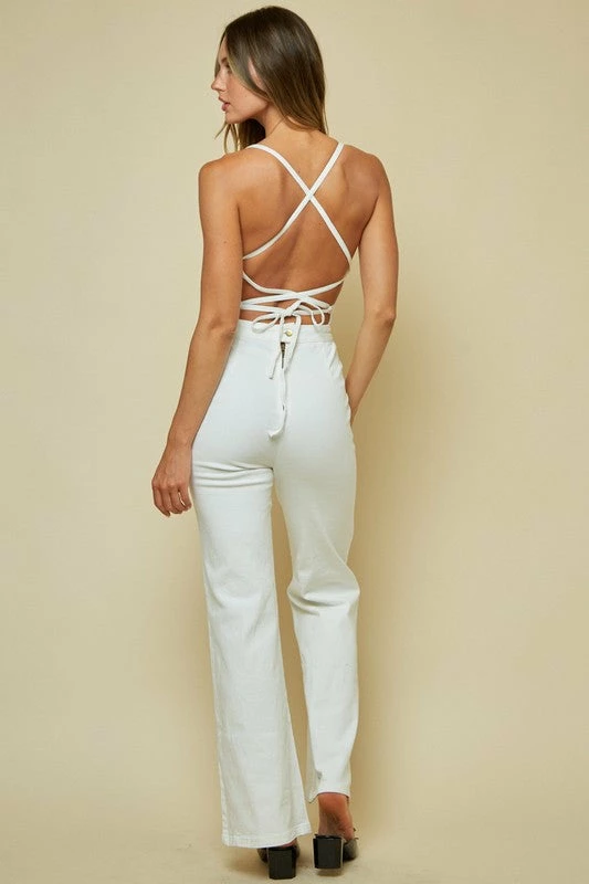 The Lacey White Tie Back Denim Bell Bottom Jumpsuit.