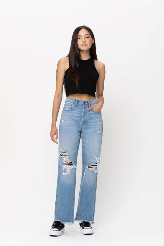 The '90s called and they wanted to tell you how good you look in the Super High Rise Fayed Hem Dad Jeans! Sturdy, light wash denim shapes these dad-worthy jeans that have a high-waisted fit with belt loops and a five-pocket cut. The relaxed straight legs have distressing detail finished by the frayed hem. Inseam: 31" Rise: 12"
