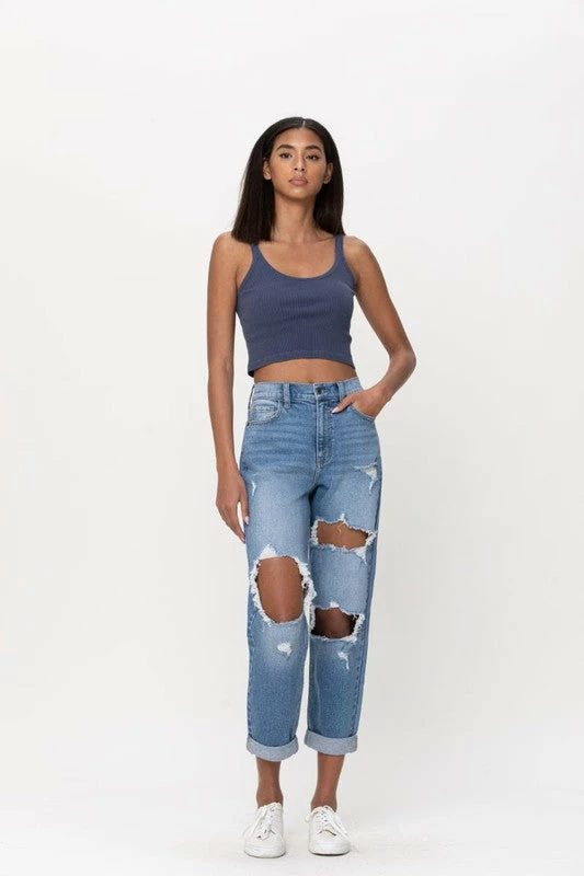 Serve up a fresh and casual look this season in these mom jeans. These go-to jeans feature ripped detailing throughout and a cool-girl-approved straight-leg fit. Additionally equipped with five pockets, belt loops and a zip fly closure. Inseam: Rolled 25" / Total 28" Rise: 11 1/4"