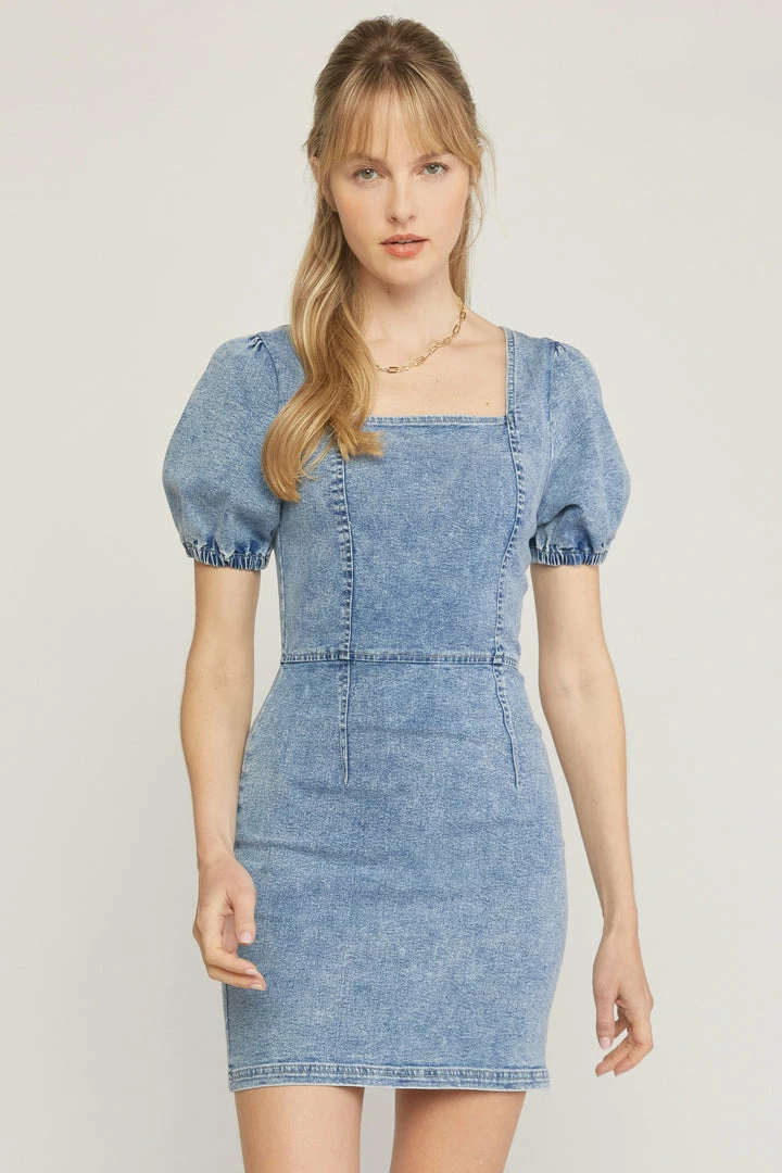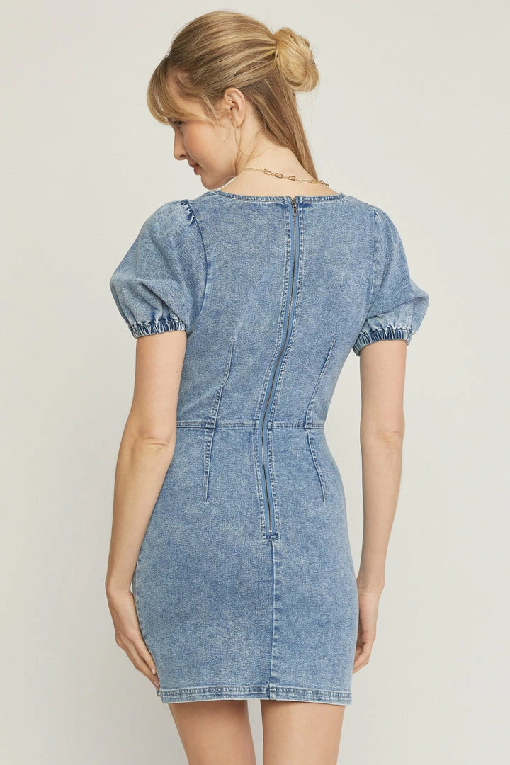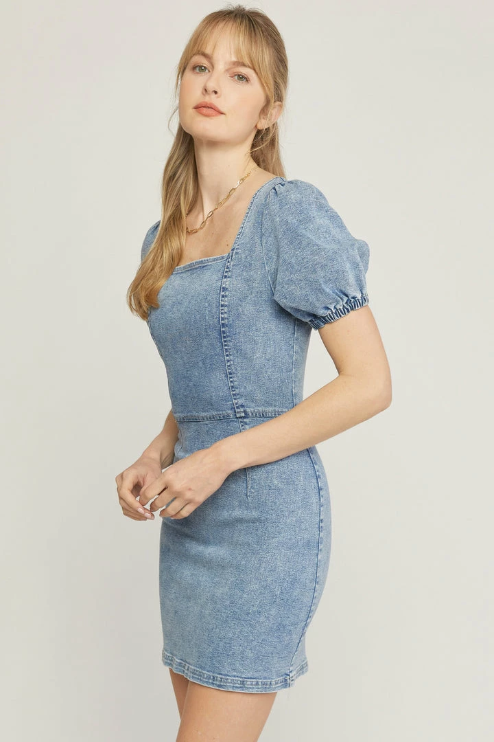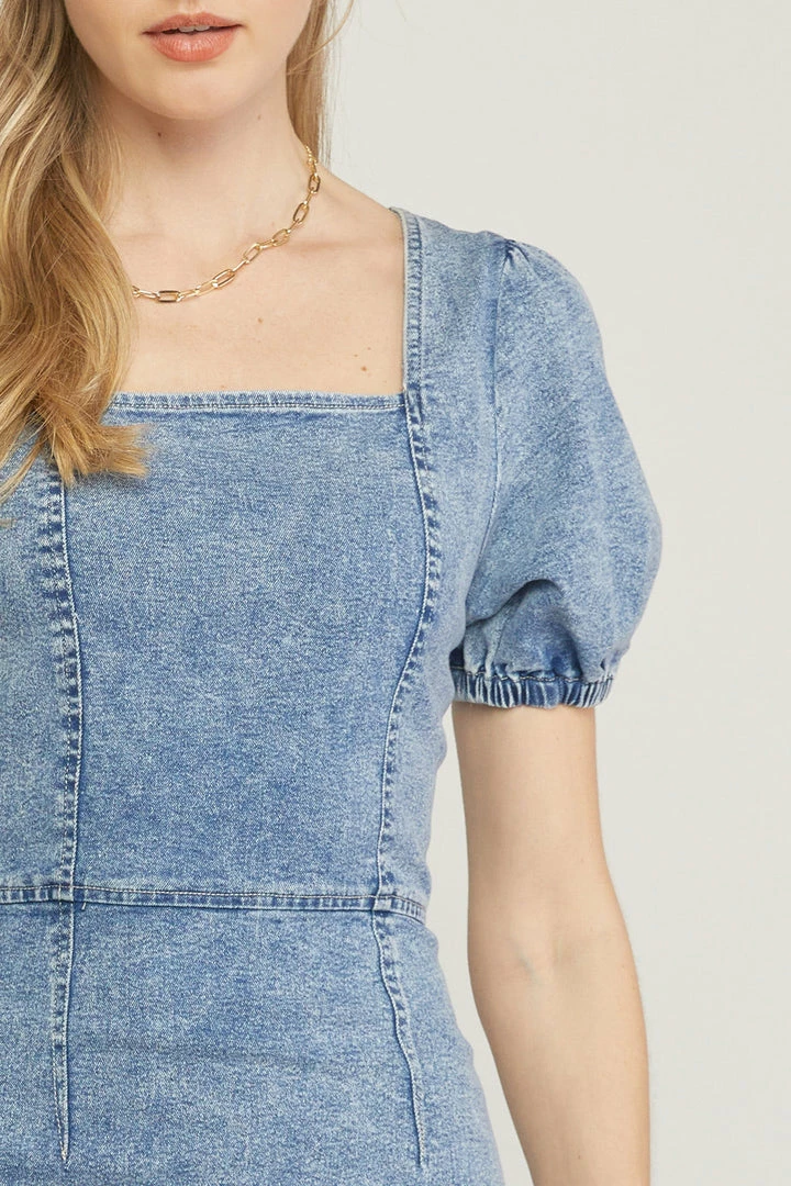 Acid washed denim square neck puff sleeve mini dress featuring open exposed zipper at back. Unlined. Woven. Non-sheer. Lightweight.