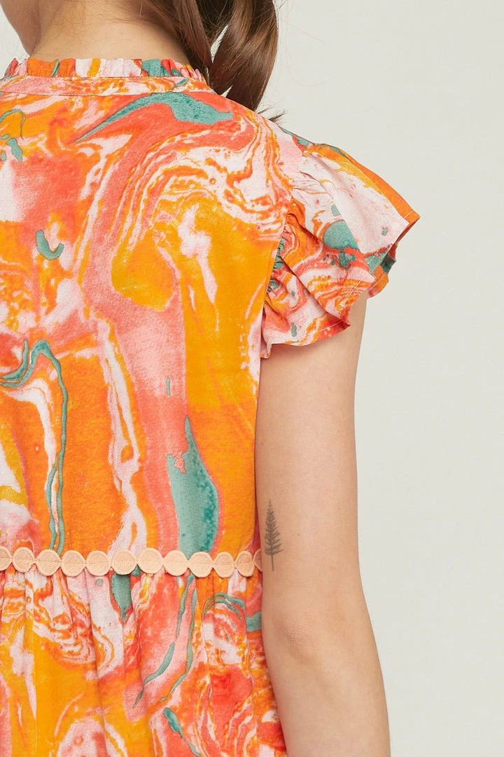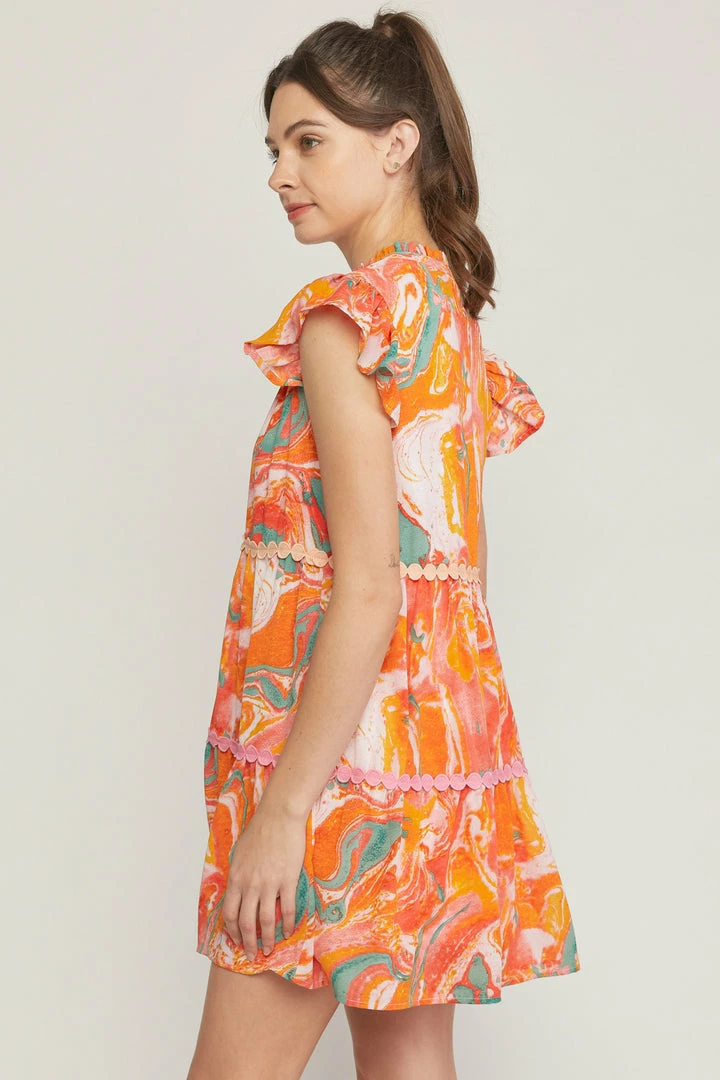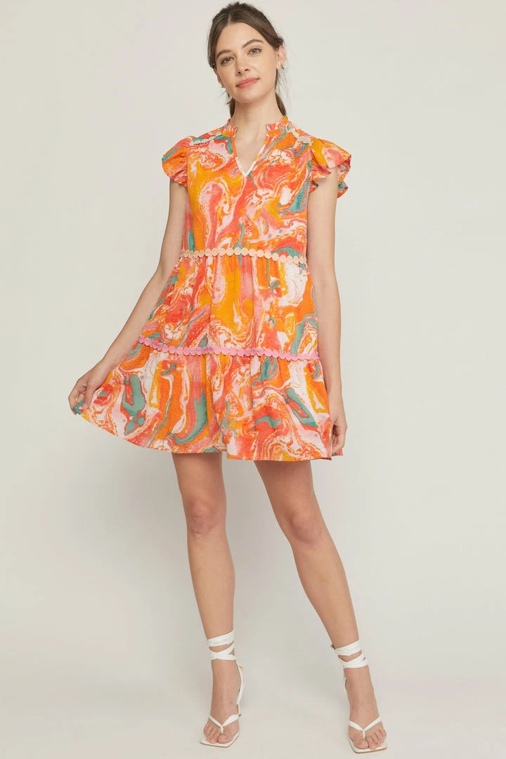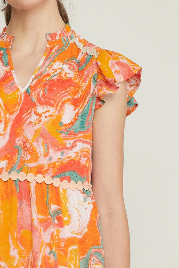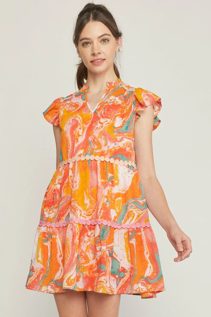 Print v-neck short sleeve tiered mini dress featuring trim detailing. Lined. Woven. Non-sheer. Lightweight.