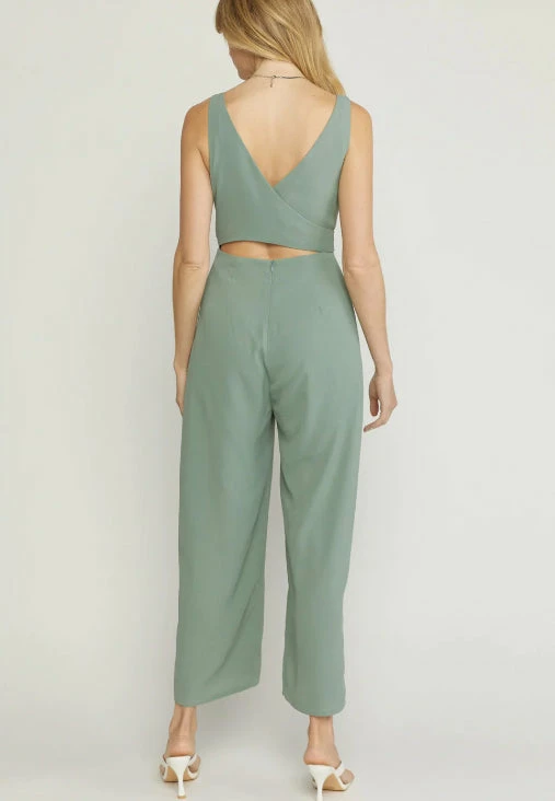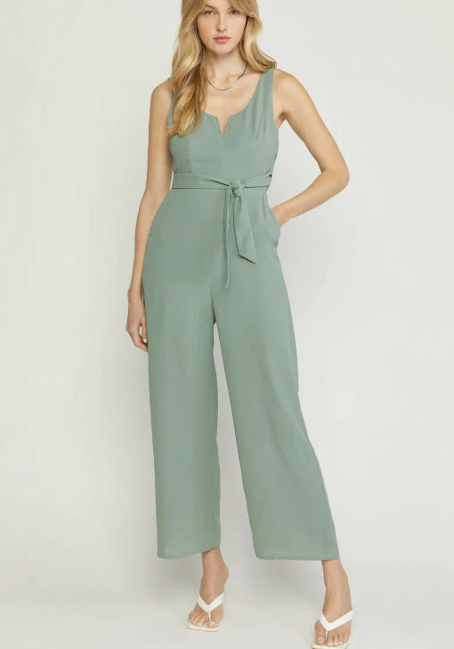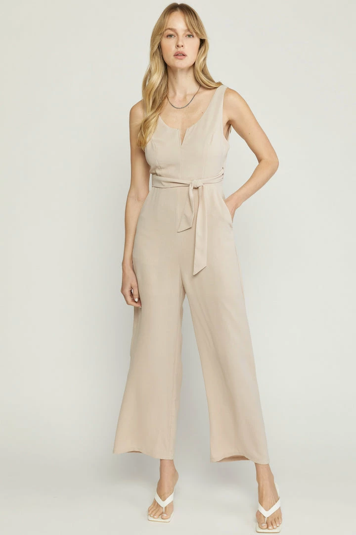Solid v-neck sleeveless jumpsuit featuring wrap around self tie closure. Wire insert at v-neck. Pockets at sides. Zip closure at back. Lined. Woven. Non-sheer. Lightweight.