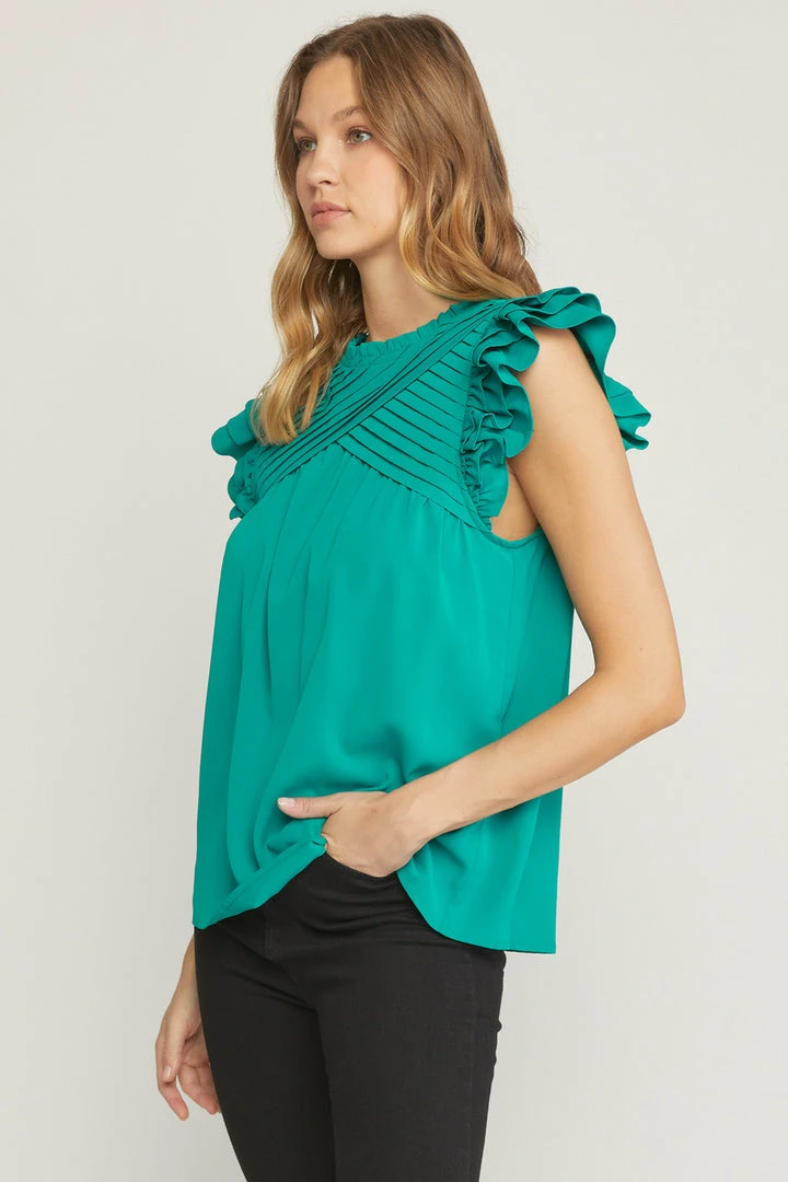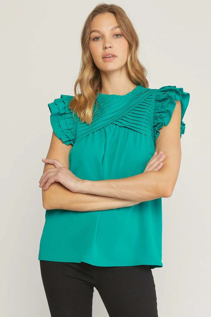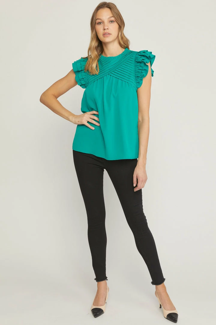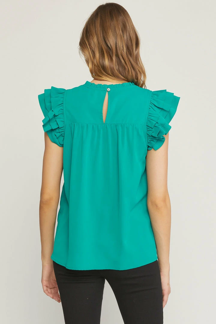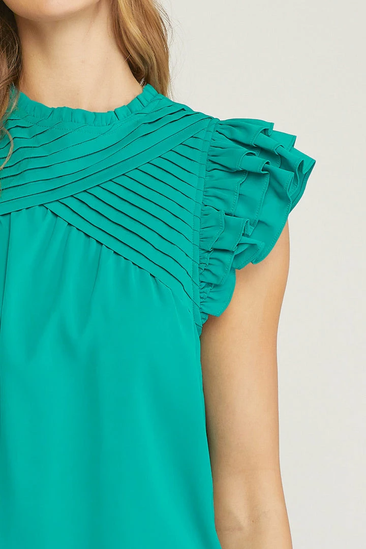 Solid round neck ruffle sleeve top featuring pleat detailing at front. Keyhole button closure at back. Lined. Woven. Non-sheer. Lightweight.