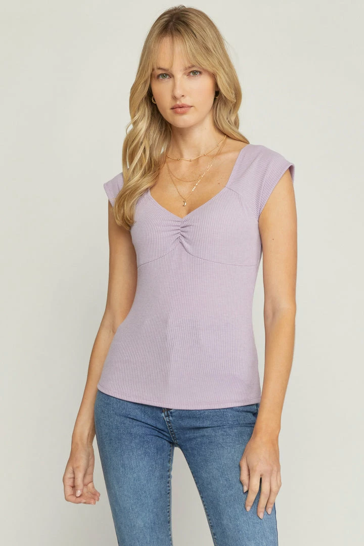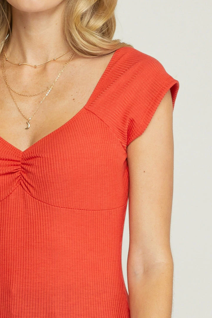 Solid sweetheart neckline ribbed short sleeve top featuring ruching at bust. Unlined. Knit. Non-sheer. Lightweight.