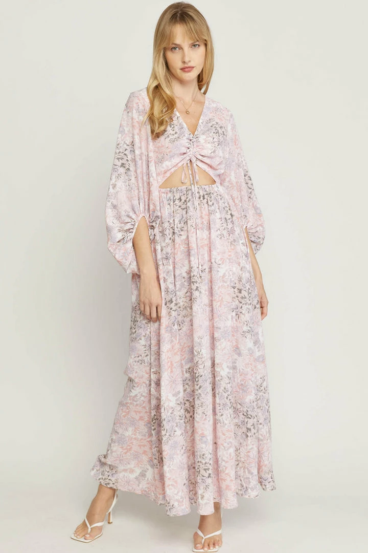 Floral print v-neck long sleeve maxi dress featuring cut out at waist. Ruching detail at bust with self tie closure. Zip closure at back. Lined. Woven. Non-sheer. Lightweight.