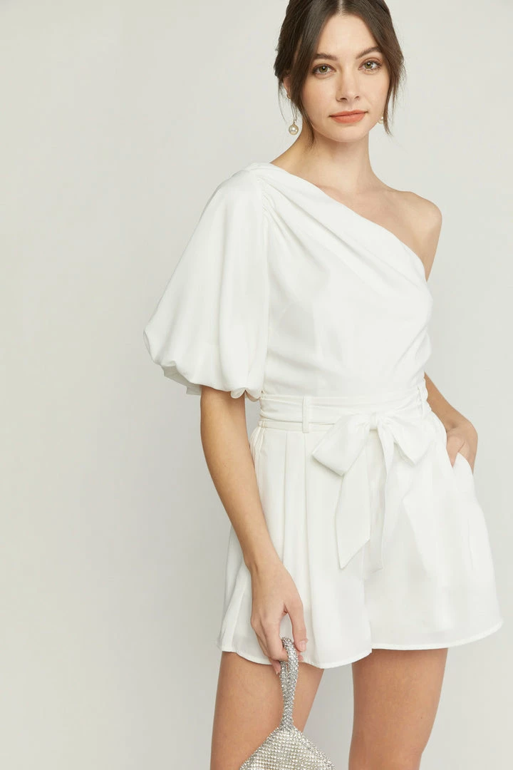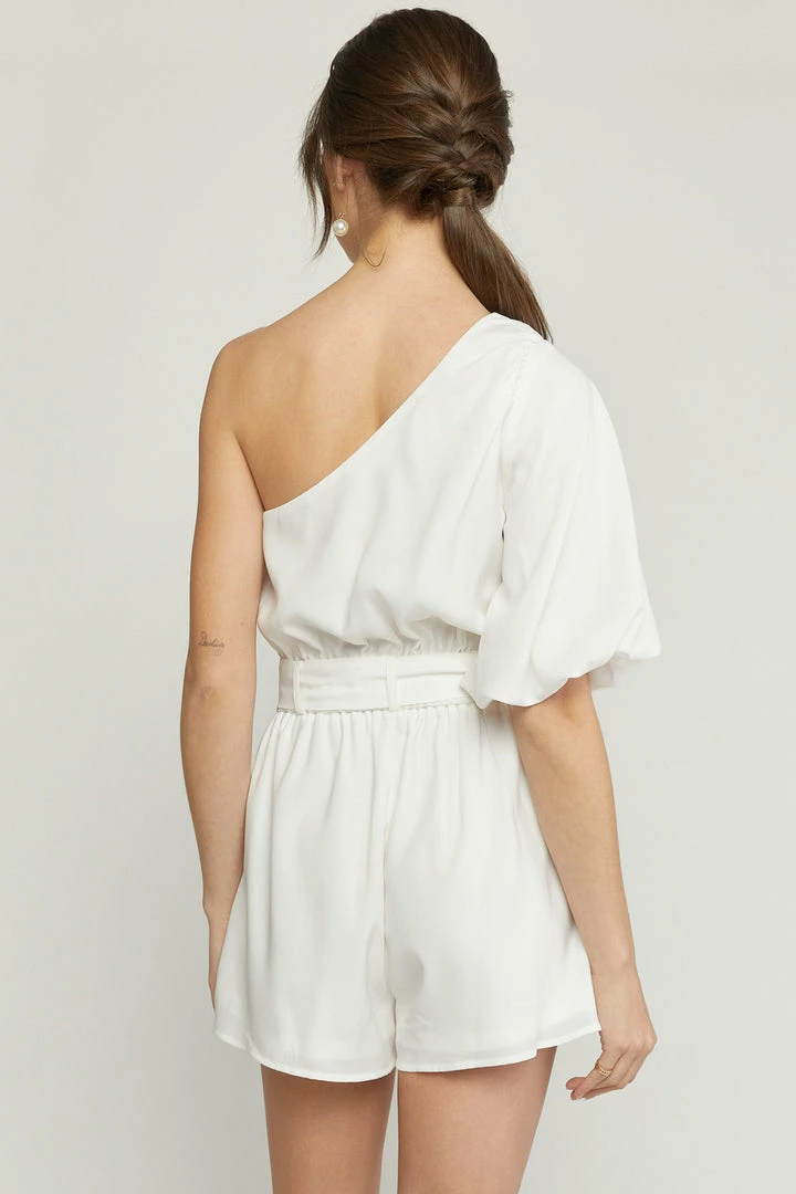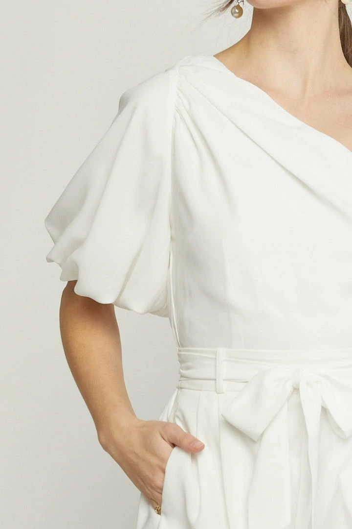 Solid one shoulder bubble sleeve romper featuring self tie at waist. Zip closure at side. Pocket at sides. Lined. Woven. Non-sheer. Lightweight.