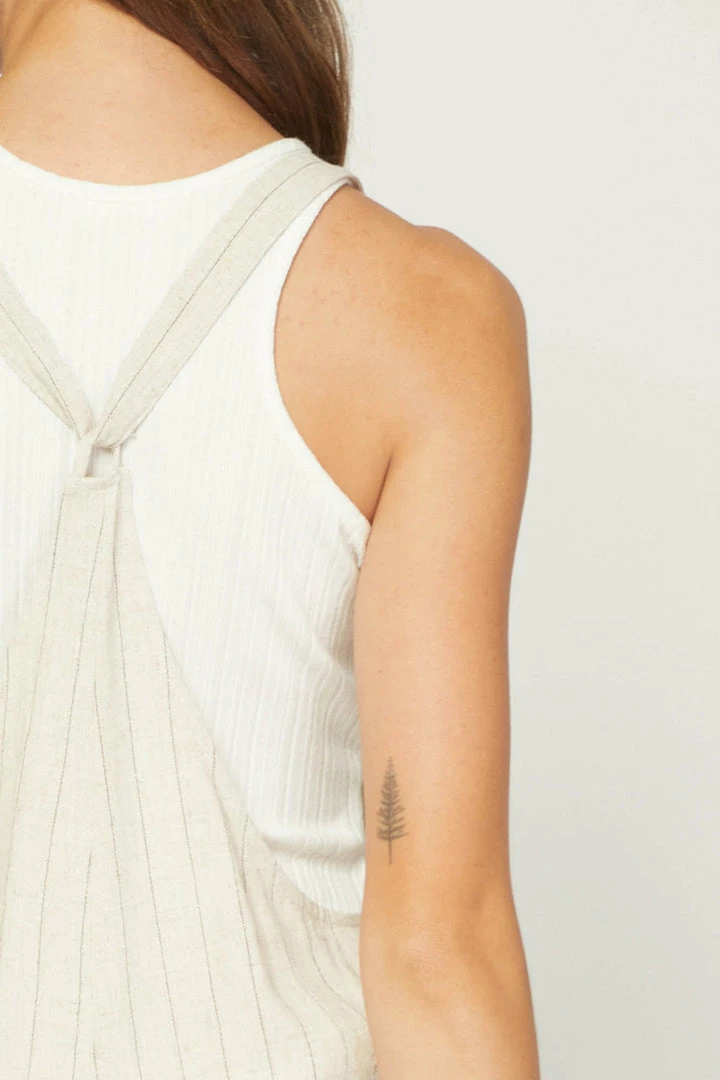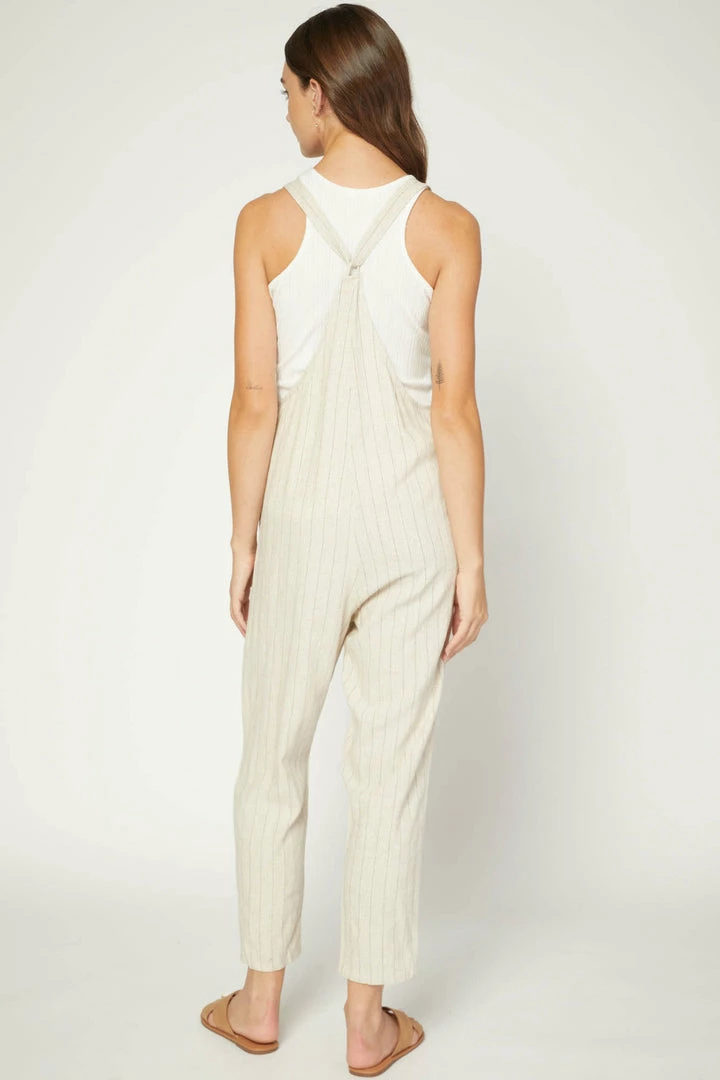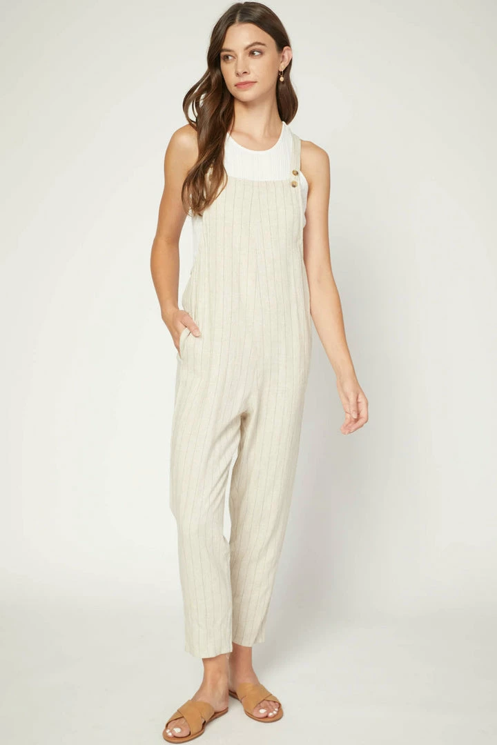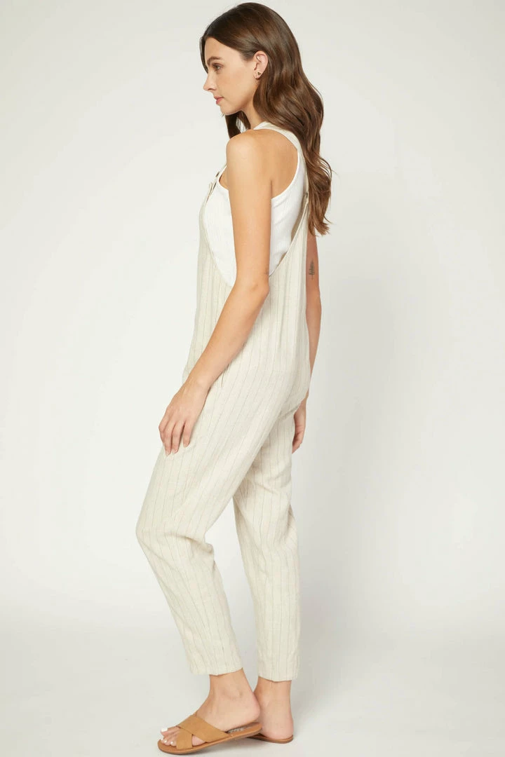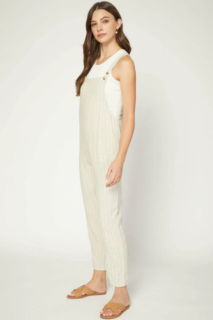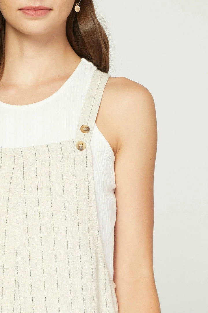 Pinstripe overalls featuring adjustable straps with button closure. Pockets at sides. Unlined. Woven. Non-sheer. Lightweight.