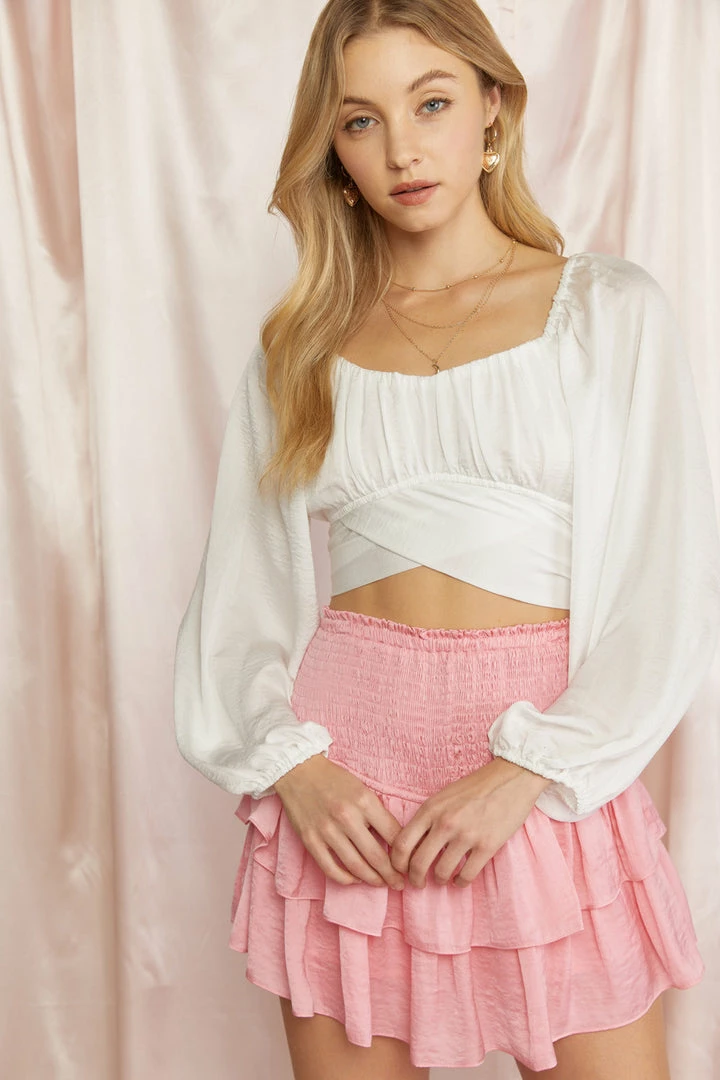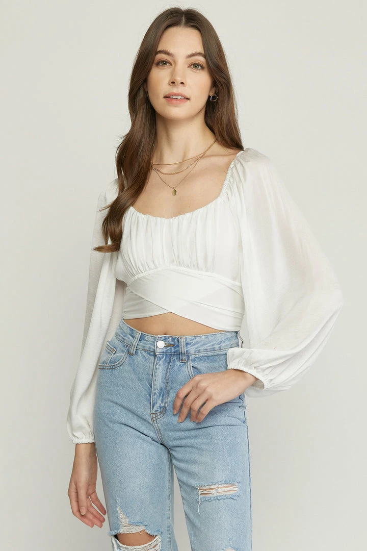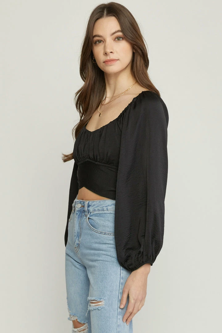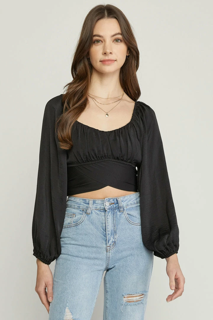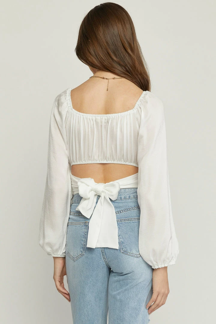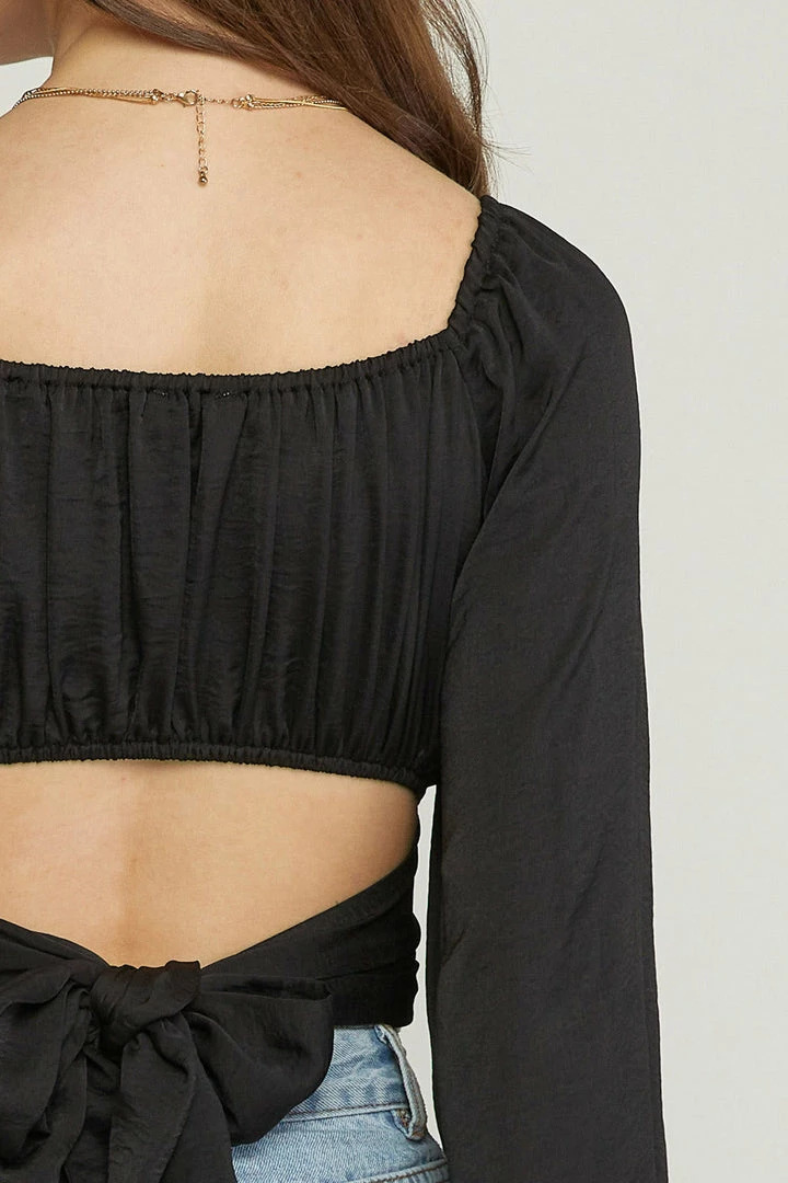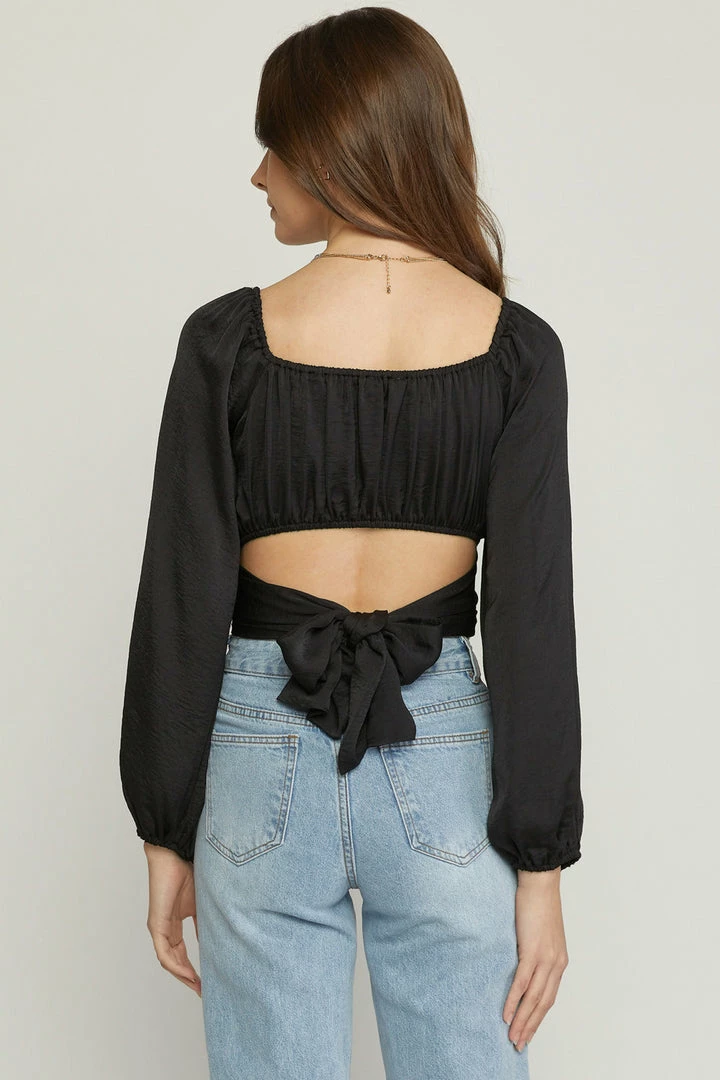 Satin square neck long sleeve cropped top featuring cut out detail at back. Self tie at back. Elastic at neckline and back. Lined. Woven. Non-sheer. Lightweight.