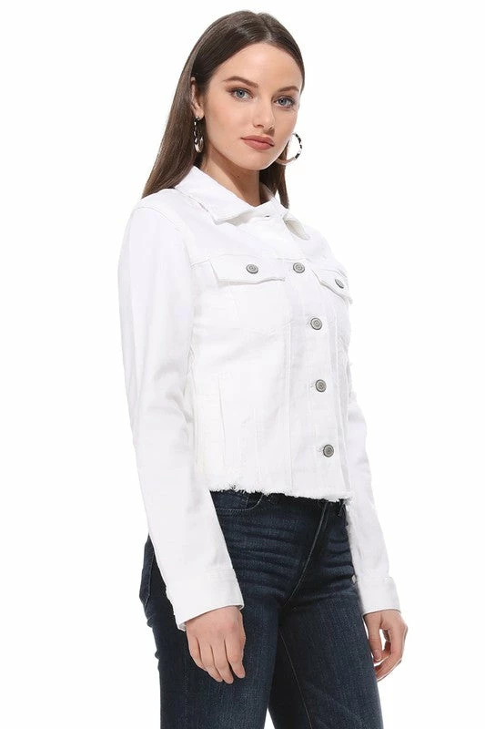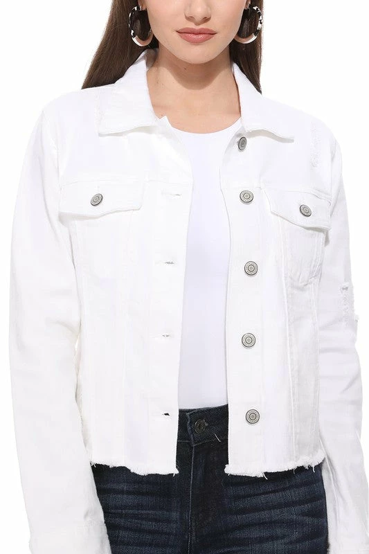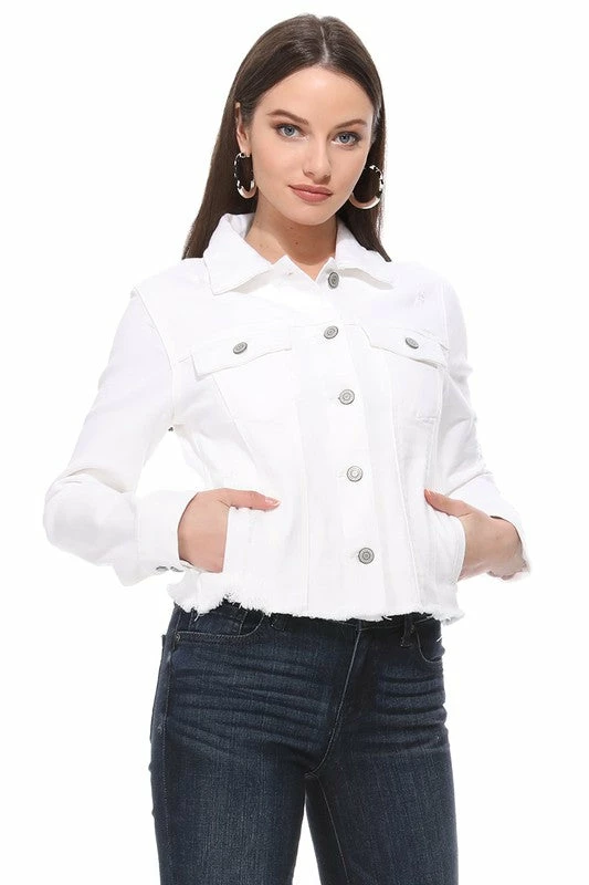 Abby raw hem fitted jacket in White Lily. Front button closure, chest flap pockets with button closures, and buttoned cuffs.