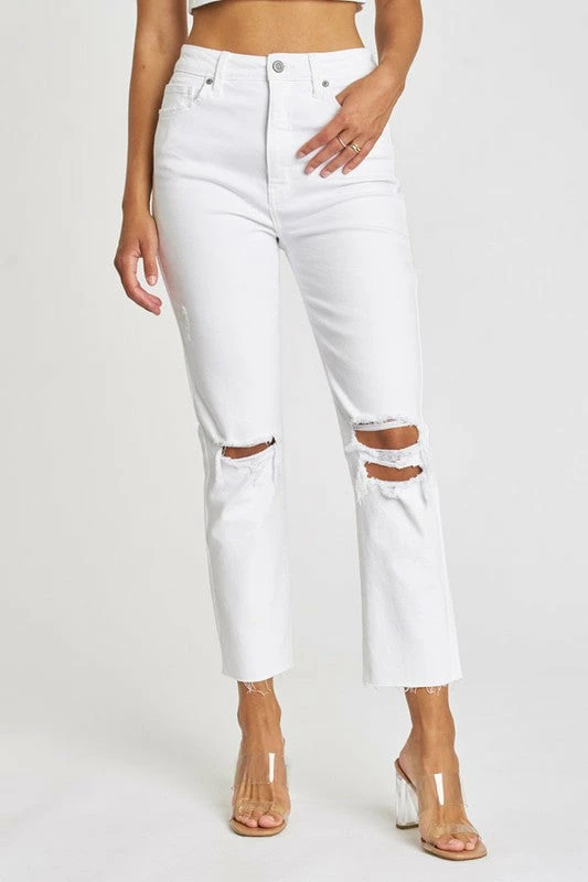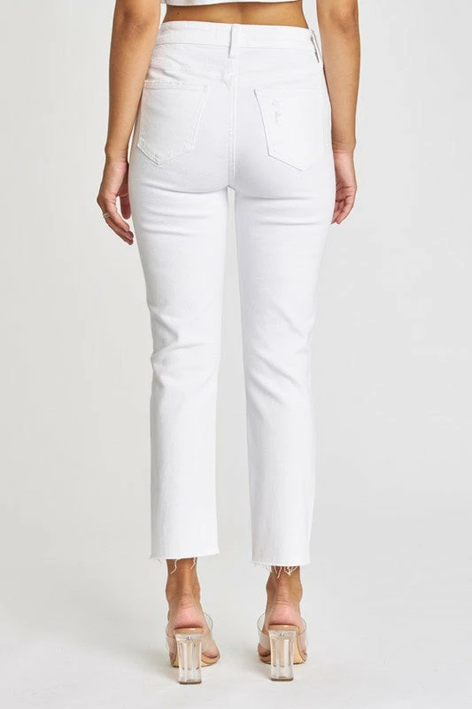 Ally ultra high rise straight jeans in White Picket Fence. Relaxed fit white wash denim with raw cut hem, knee blowout and destroyed details. Five-pocket design, belt loops, and hidden zip fly with button closure. This fit features a 12 in. ultra high rise and 26 in. cropped inseam.