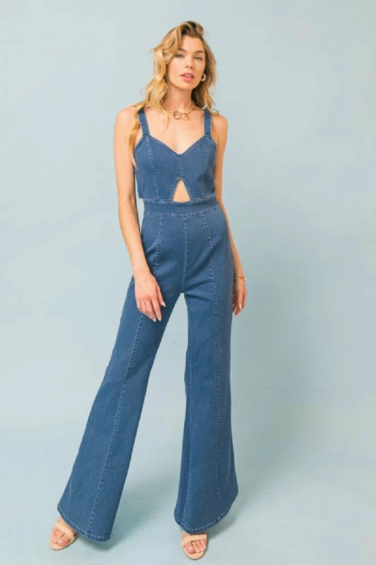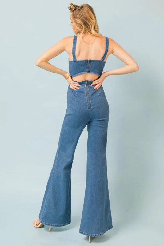 A denim jumpsuit featuring sweetheart neckline with shoulder straps, front cut out detail, bell bottom and back zipper closure. Details Self: 75% Cotton 23% Polyester 2% Spandex Size & Fit - Model is 5'8" And Wearing Size Small - Measurements Taken From Size Small - Approx. Length: 45"