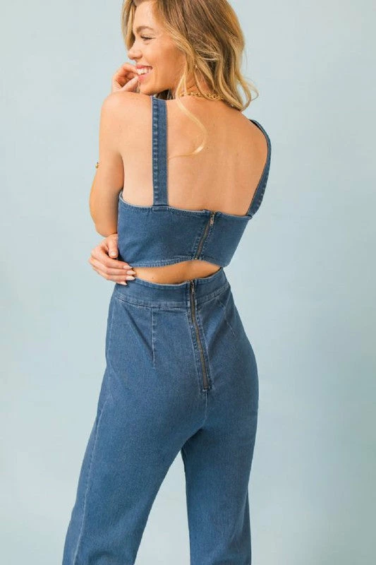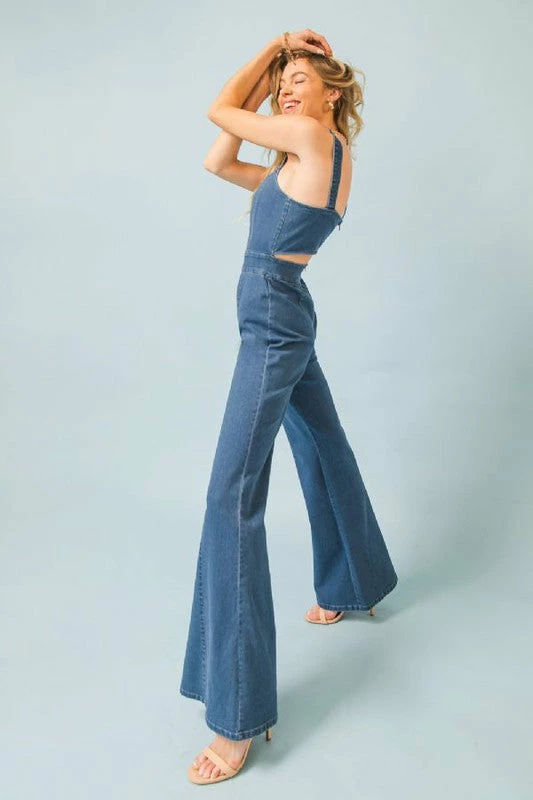 Flying Tomato The Dessie Medium Indigo Cutout Denim Jumpsuit Jumpsuits