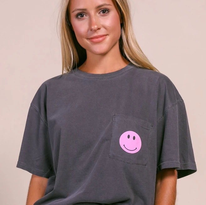 Our summer motto.. take it easy. This tee features a relaxed fit, pocket detail with smiley graphic, and pink back graphic. We love sizing up in this tee for a swimsuit cover up or to pair with biker shorts!