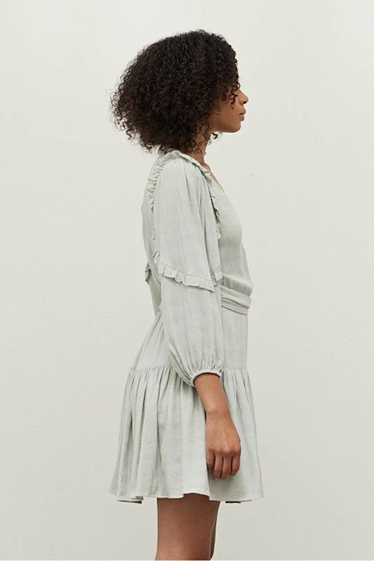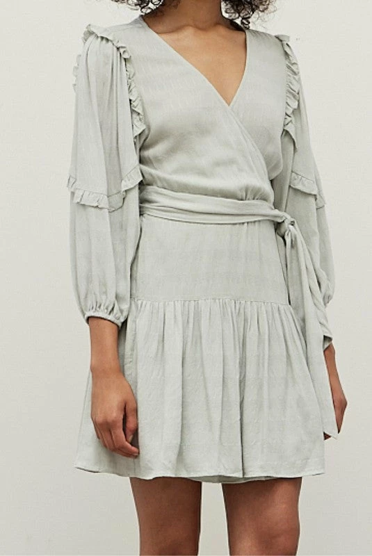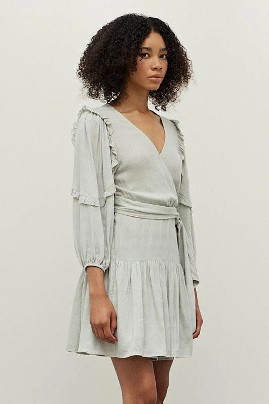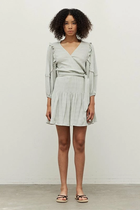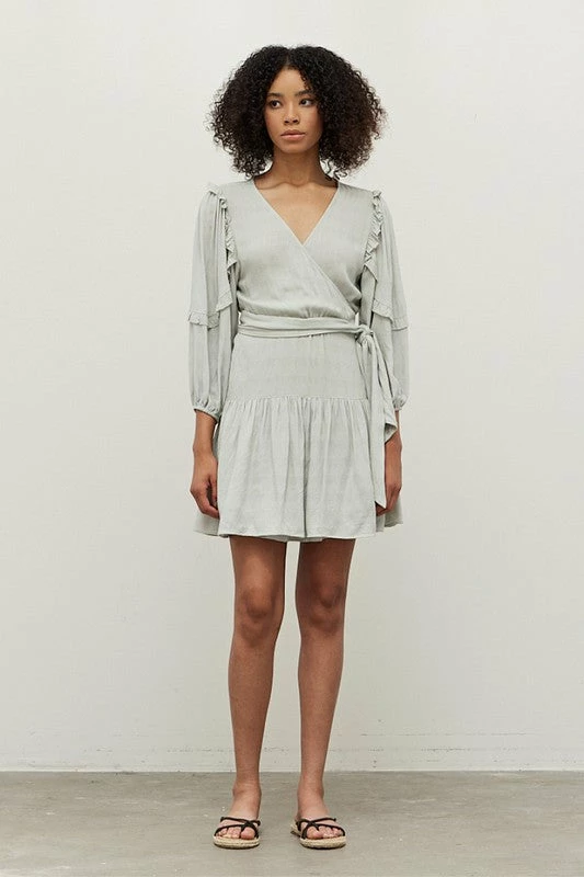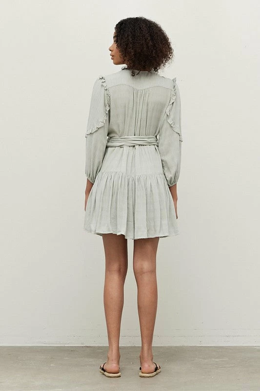 SURPLICE SELF TIE TIERED DRESS. 100% RAYON IMPORTED