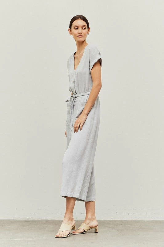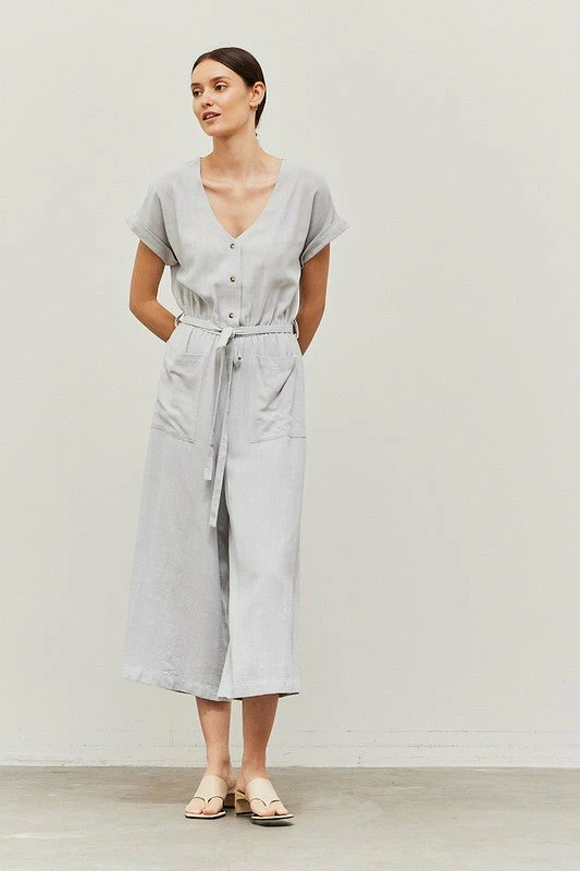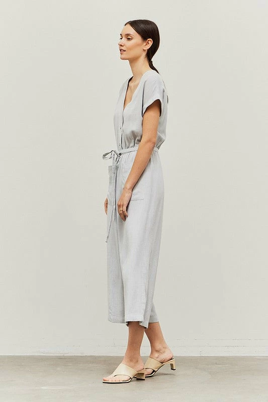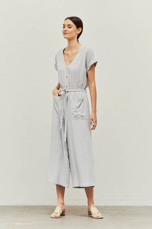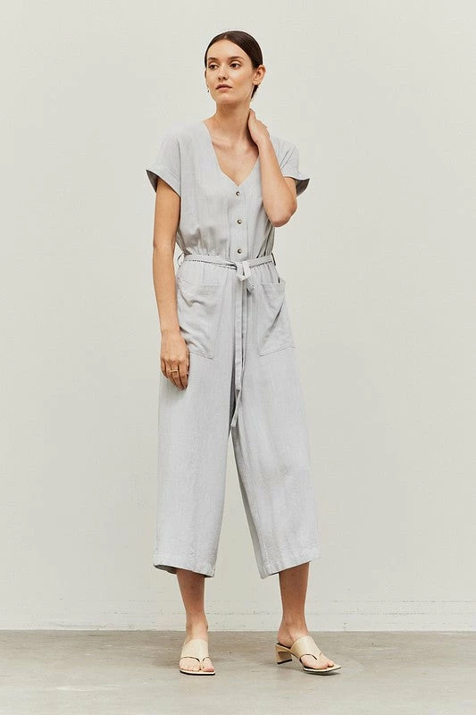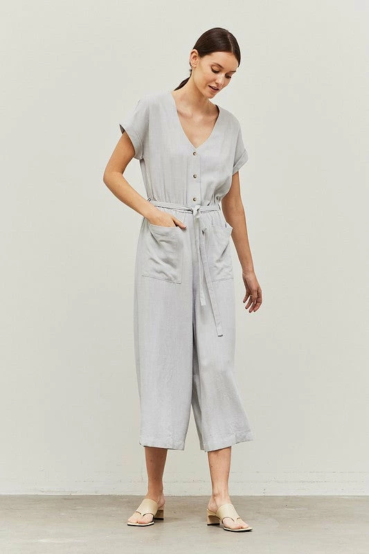 LINEN BLEND FRONT POCKET JUMPSUIT 70% RAYON 30% LINEN IMPORTED.