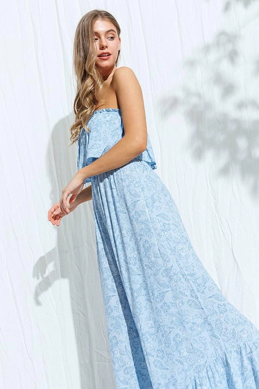 A printed tube jumpsuit featuring smocking bodice, ruffles, straight neckline, wide legs, and elastic waist band.