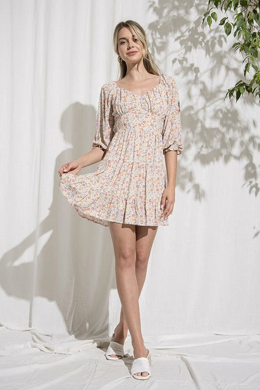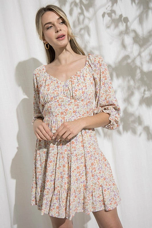 A floral print dress featuring open back with tie closure, elastic shoulder and waistband, 3/4 sleeves with elastic cuffs, and tier ruffles.