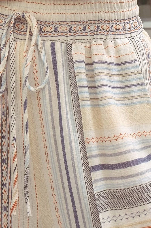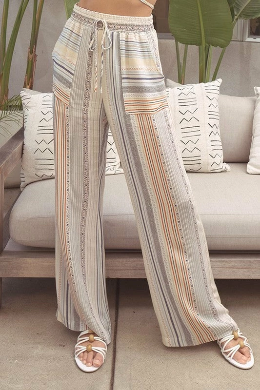 A multi striped print set featuring adjustable tie up closure, surplice neckline, cropped, shirring at shoulder, and matching pants, elastic waistband, front tie, and patch pockets.