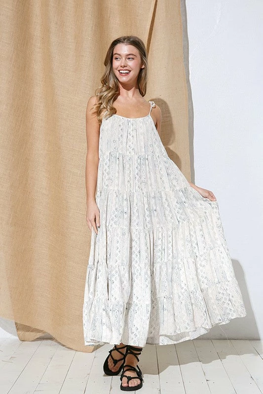 A printed maxi dress featuring shoulder tie with tassels, ruffles and sleeveless.