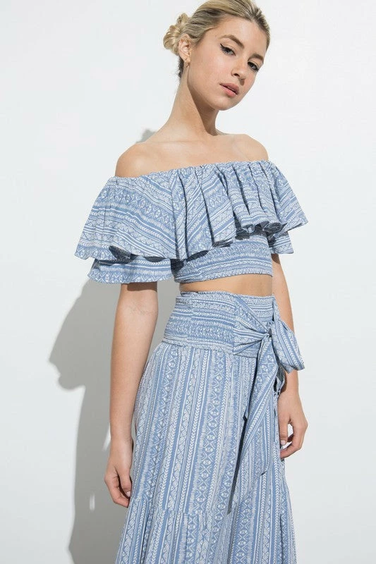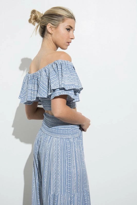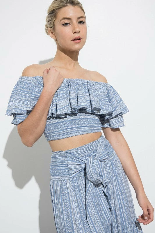 In The Beginning Clothing The Belize Blue Print Ruffled Top Tops