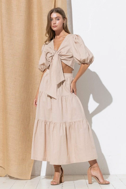 Beige Wrap Top With Puff Sleeve And Deep V Neck Fabric: 55% Linen 45% Cotton.