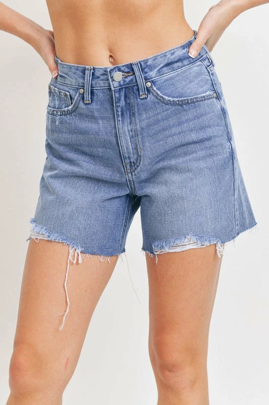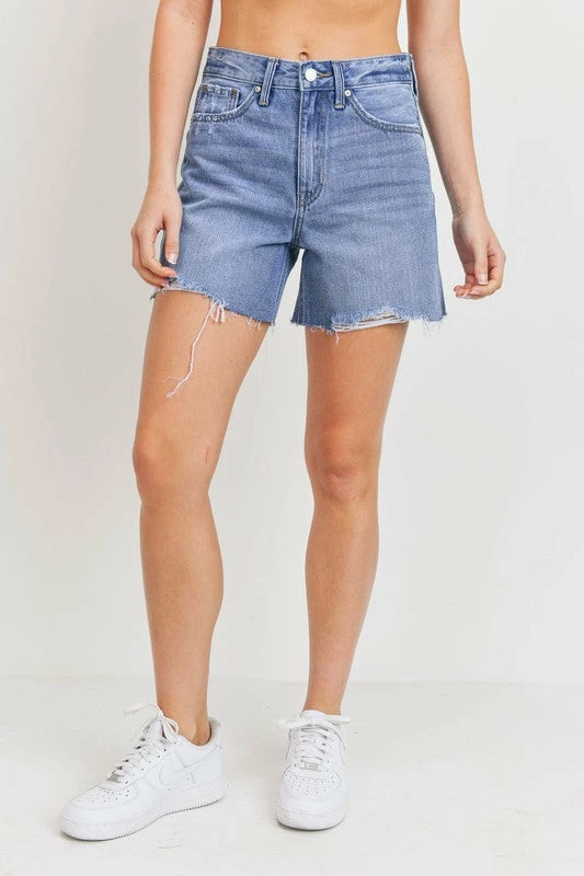 MIDI HEM DISTRESS JEAN SHORTS IN MEDIUM WASH DENIM. 11" RISE, 5" INSEAM, 12" OPENING. NON STRETCH.