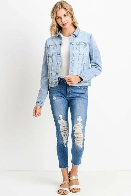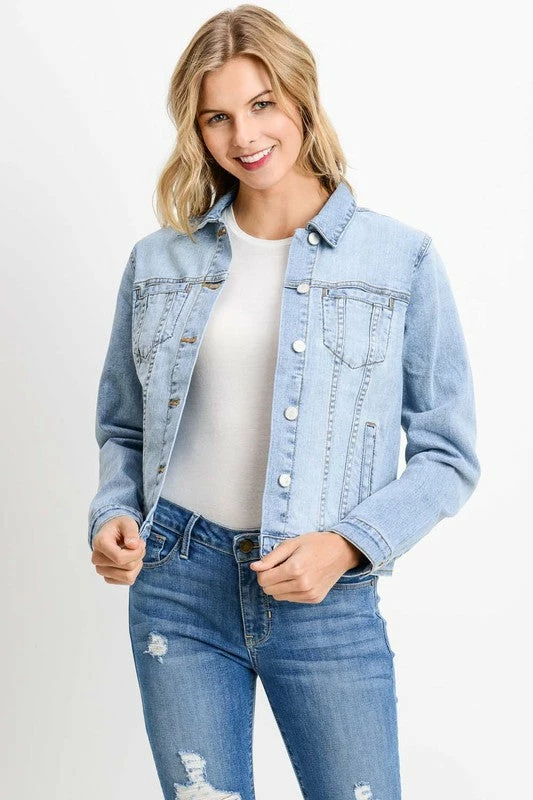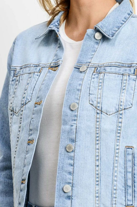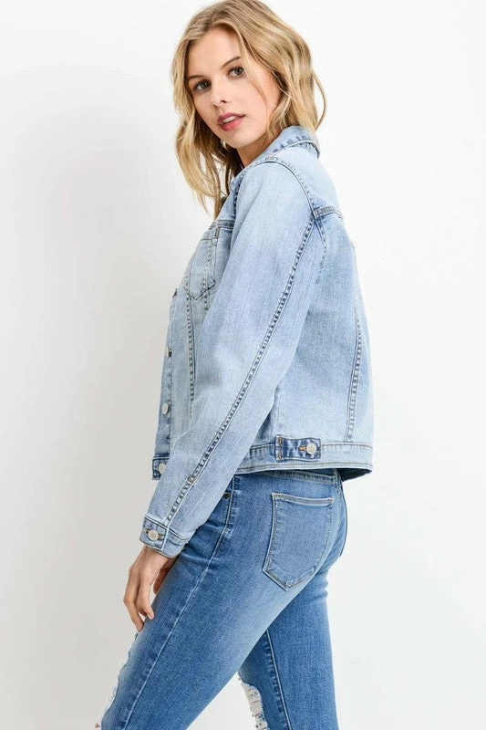 OVERSIZED DENIM JACKET WITH WELT POCKETS IN LIGHT WASH DENIM 18 5/8″ CF, 35 1/4″ SWEEP.