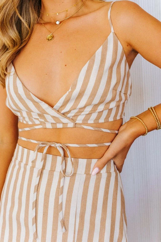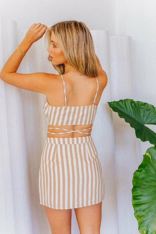 WOVEN 65% COTTON, 35% POLYESTER **TOP ONLY** (MATCHING SET WITH: The Amanda Tan & White Striped Mini Skirt) MODEL IS WEARING A SIZE SMALL MODEL SPECS HEIGHT: 5’9″ BUST: 32B WAIST: 24″ HIPS: 34″