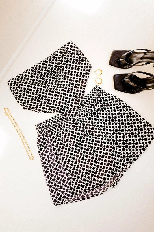 100 % POLYESTER **SHORTS ONLY** (MATCHING SET WITH: The Dalia Black & White Handkerchief Top) MODEL IS WEARING A SIZE SMALL MODEL SPECS HEIGHT: 5’8″ BUST: 32A WAIST: 24″ HIPS: 34″