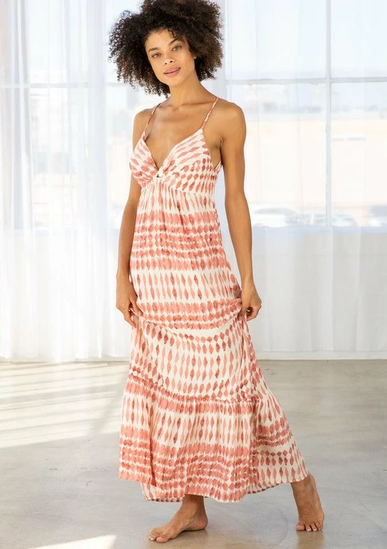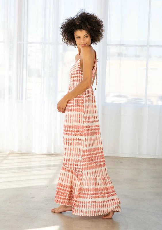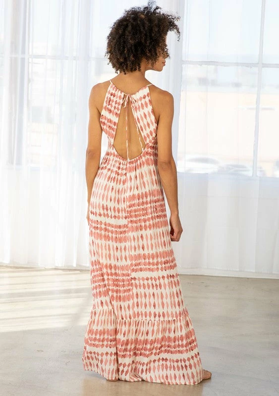 Diamond print twist front maxi dress in rayon gauze. Featuring a twist front detail, a tiered skirt, spaghetti straps, an open back detail, a drawstring neckline with a tie back detail, and an empire waist.