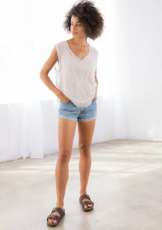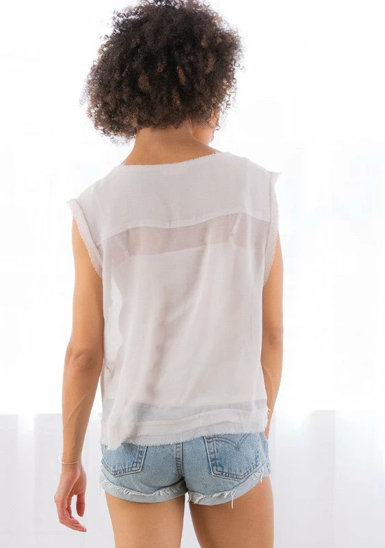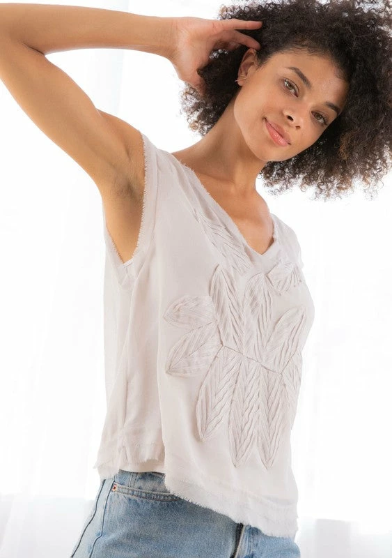 A beautiful chic sleeveless chiffon floral blouse. Features a wide v neckline, a frayed hem, and a floral applique cutout. Removable lining included.