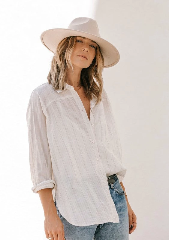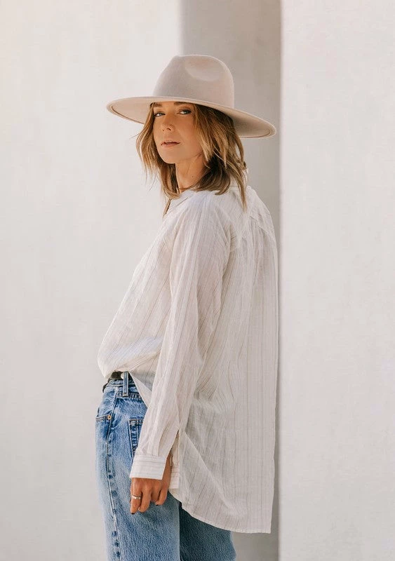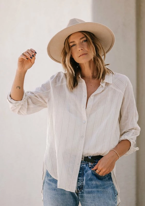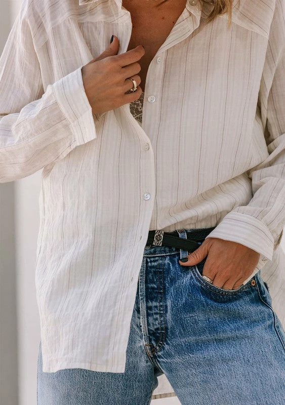 Yard dyed striped long sleeve collared button up top. A boho business casual look.