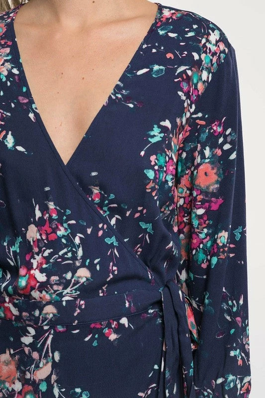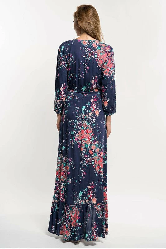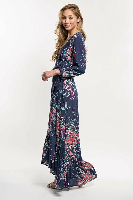 Floral print maxi wrap dress. Featuring a v-neckline, a side tie closure, three quarter length sleeves, a cascading ruffle trimmed hemline, and a wrap fit and flare silhouette.