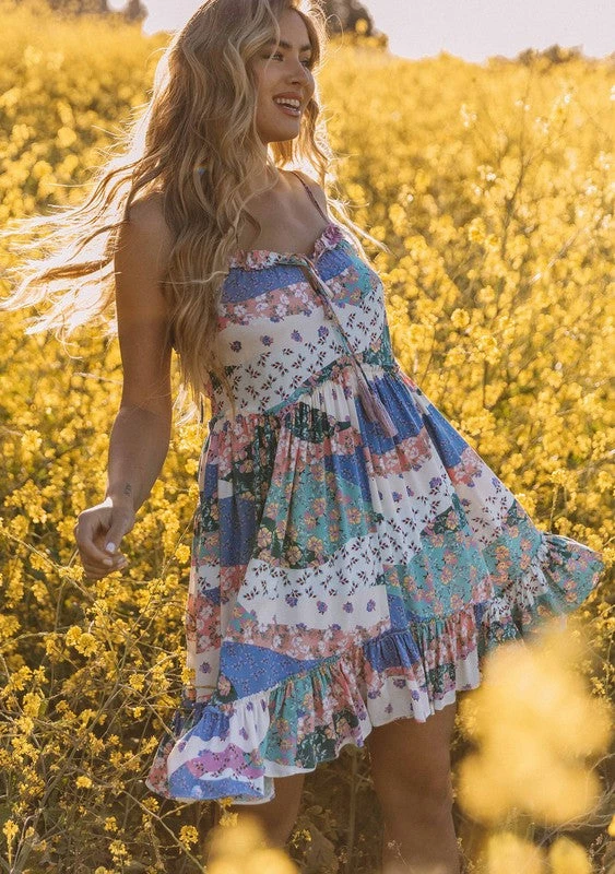 A bohemian, floral patchwork, tiered mini dress. Features a ruffled neckline and keyhole detail, adjustable tie straps, and a loose flowy fit.