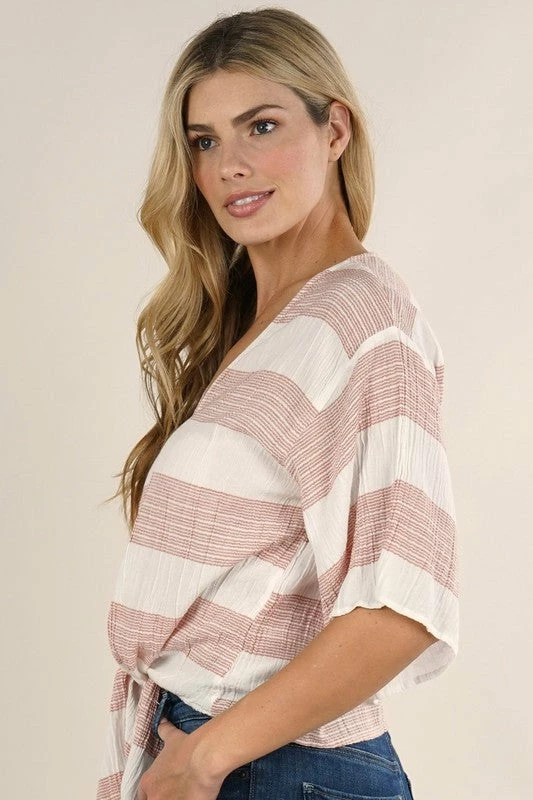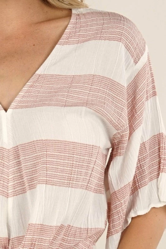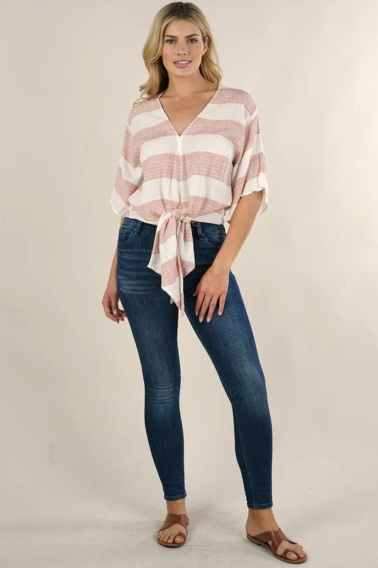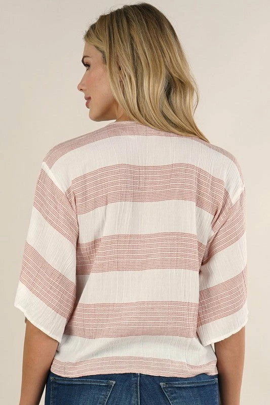 The Margot Rust & White Striped Kimono Sleeve Top. Yarn dye striped, v-neck top with tie front and kimono sleeve details.