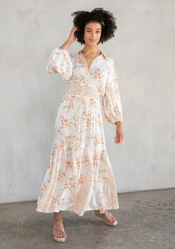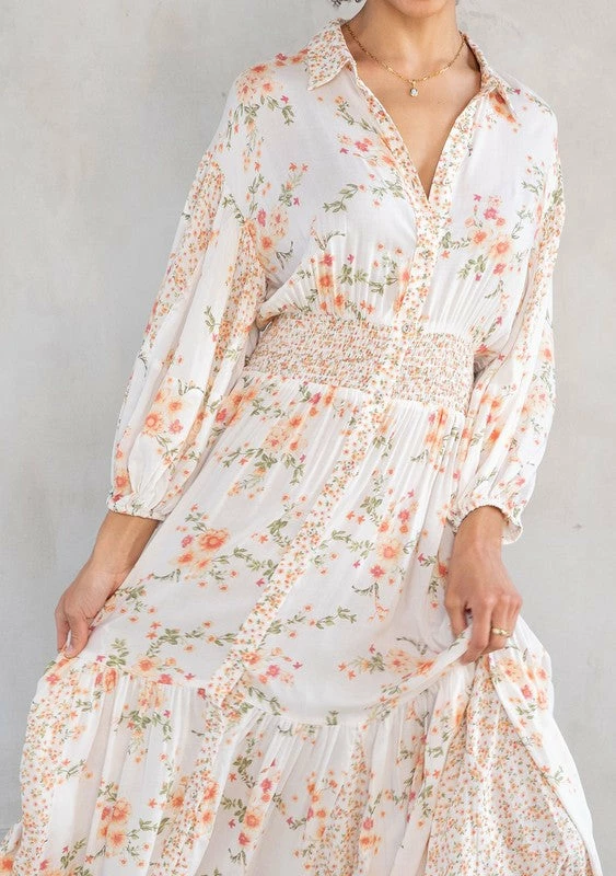 Ultra bohemian maxi dress in a beautiful mixed floral challis print. Features 3/4 sleeves with an elastic cuff, a functional button front, and a collared neckline. A tiered skirt and smocked waistband finish off this Spring-ready dress. Lined.