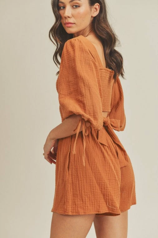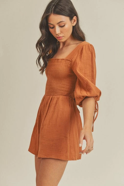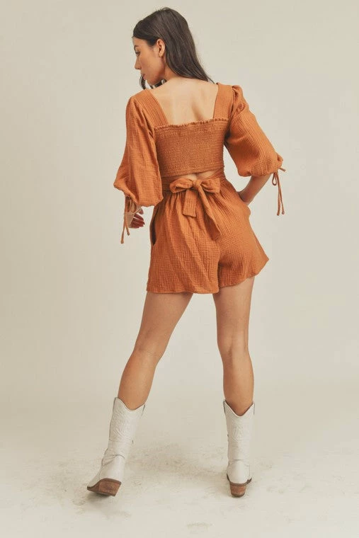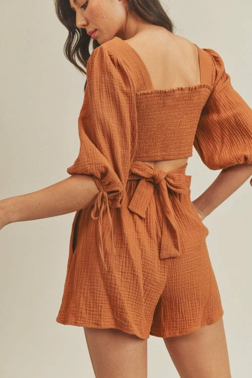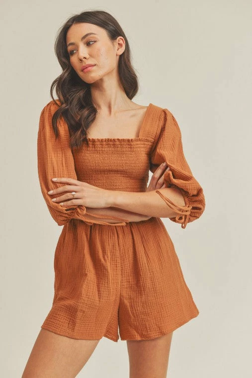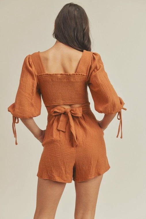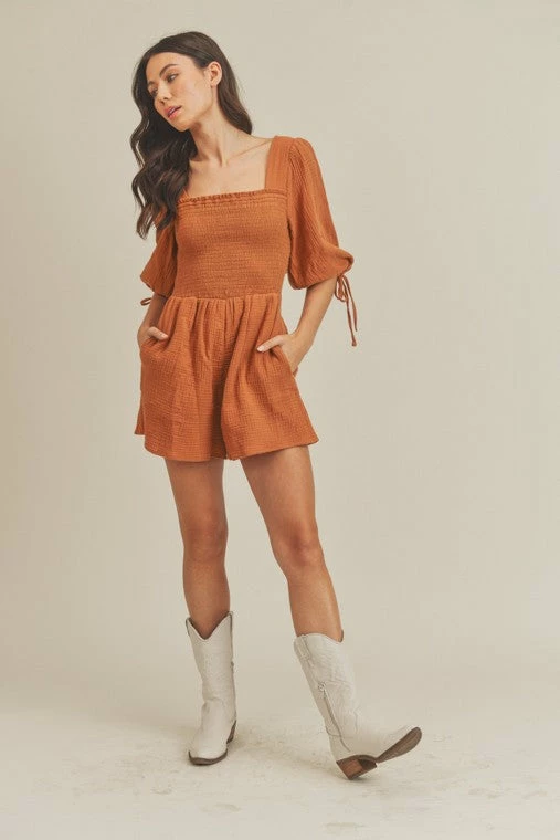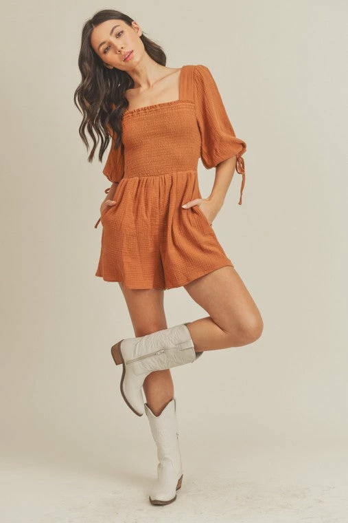 -Smocked Back Tie Romper -Square neckline -Cotton crinkle gauze fabrication -Side pockets Care instructions: HAND WASH COLD / DO NOT BLEACH / LINE DRY / IRON LOW IF NEEDED / DO NOT TUMBLE DRY