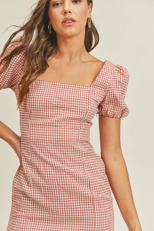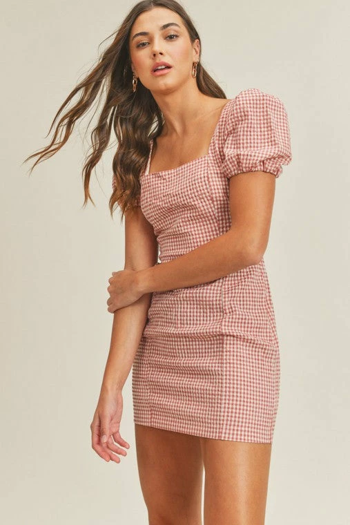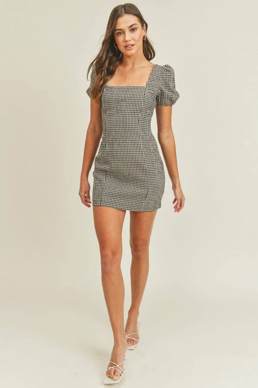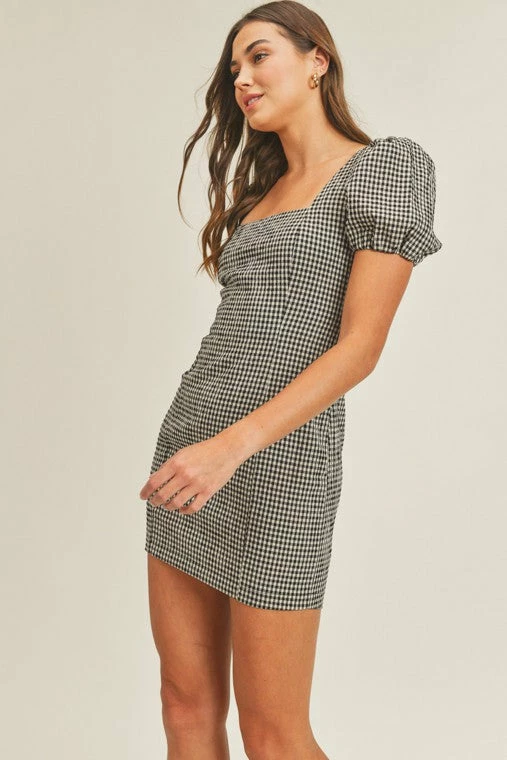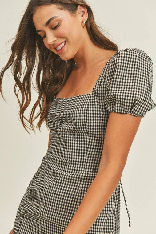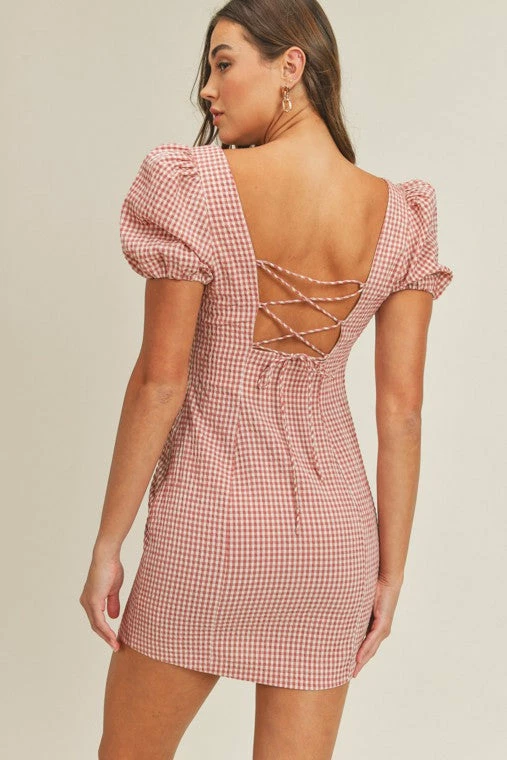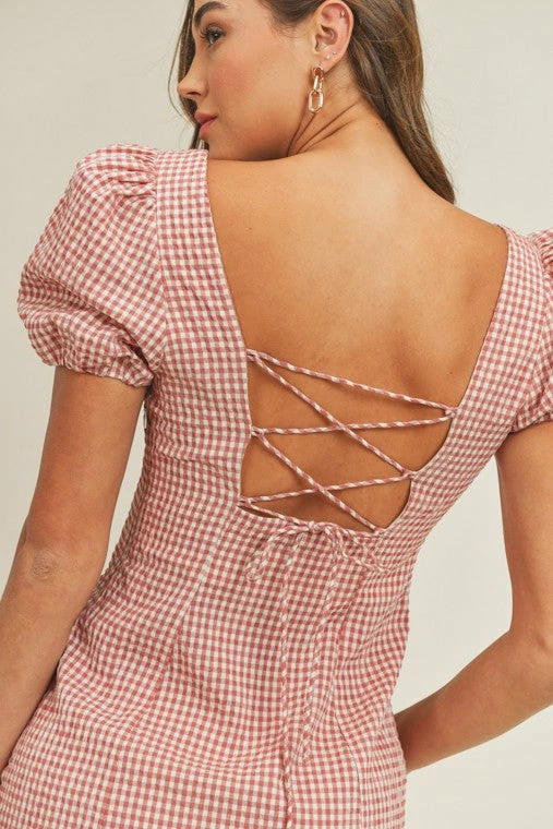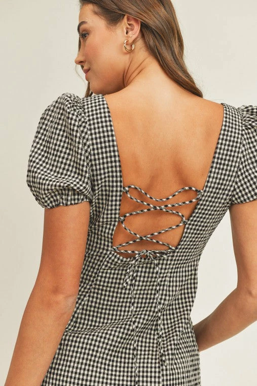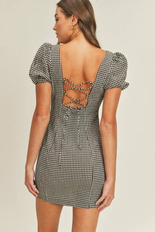 -Gingham Mini Dress -Short puff sleeves -Lace up tie back detail -Side zipper closure
