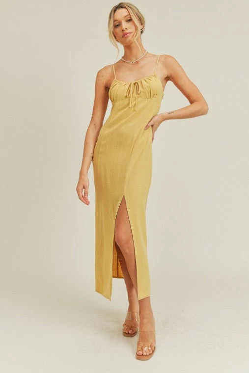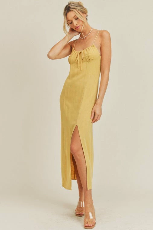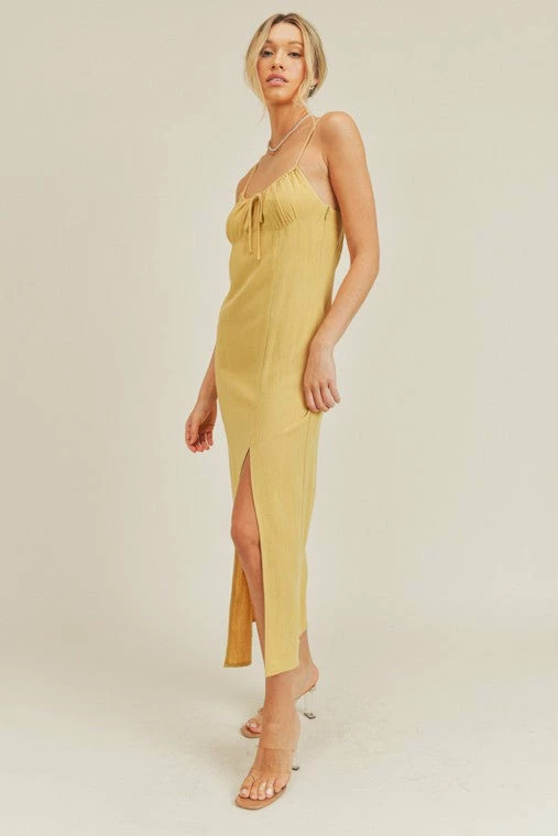 -Cami Strap Midi Dress -Adjustable straps -Front slit detail -Front tie string -Side zipper closure