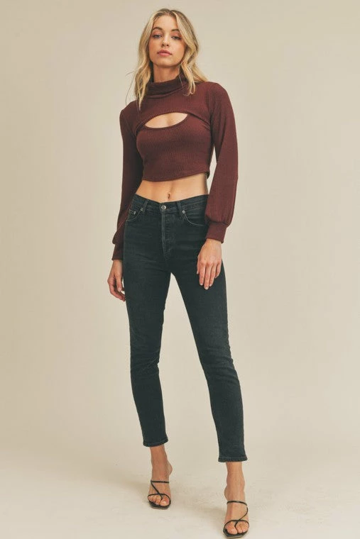 -Ribbed Knit Shrug Top -Turtleneck -Cropped fit -Long sleeves Care instructions: HAND WASH COLD, DO NOT BLEACH, DO NOT TUMBLE DRY, DRY FLAT, LOW IRON IF NEEDED