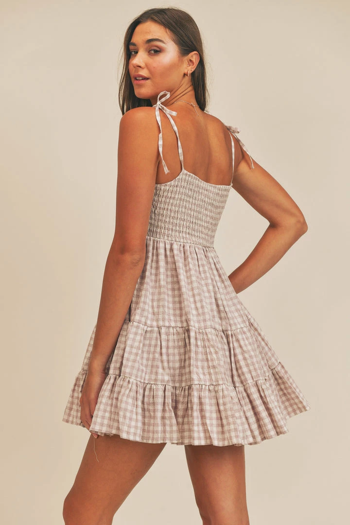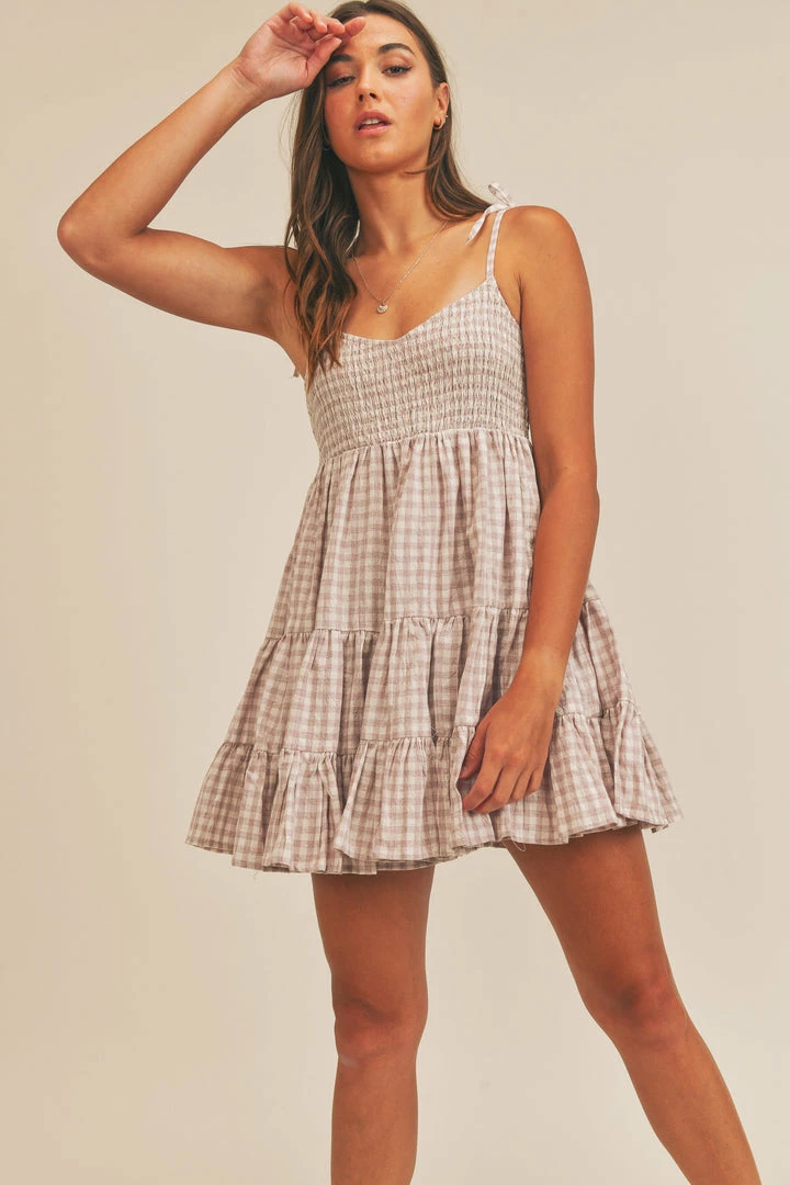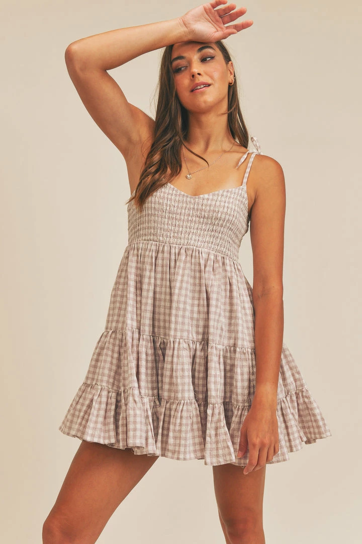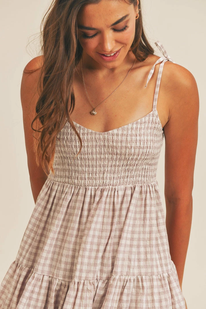 Self tie spaghetti strap gingham print babydoll dress with smocked bust. 100%COTTON.