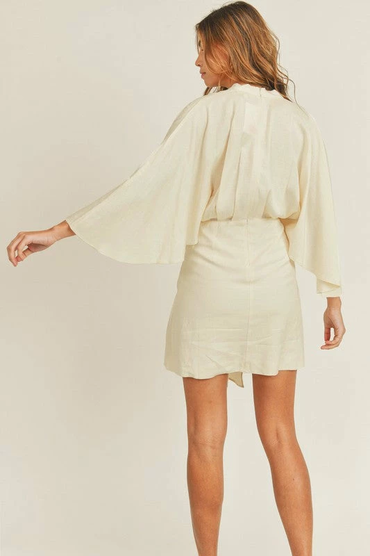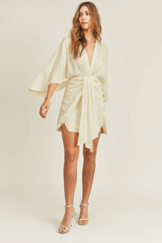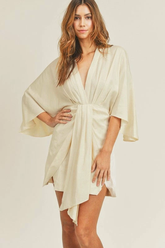 Satin deep v-neck short dolman sleeve front draped and pleated detail mini dress. Back invisible zipper.