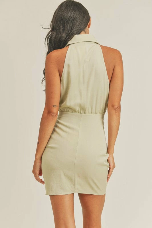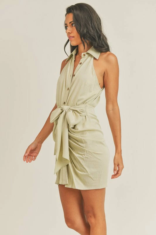 Tencel sleeveless button down shirt style mini dress with front tie detailing. 70%TENCEL 30%RAYON