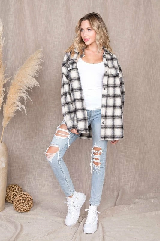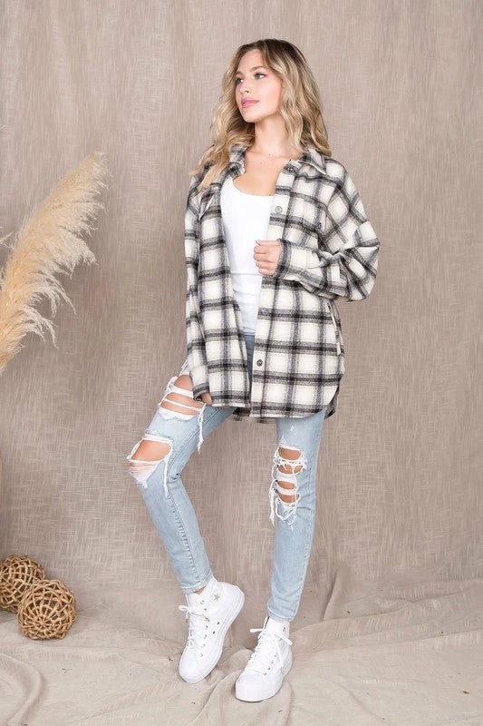 The perfect plaid print for this fall! This soft and comfortable shacket can be worn year long. Slightly oversized fit. Pleated sleeves. Button down closure. Model is 5’7 modeling size medium.