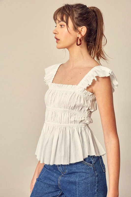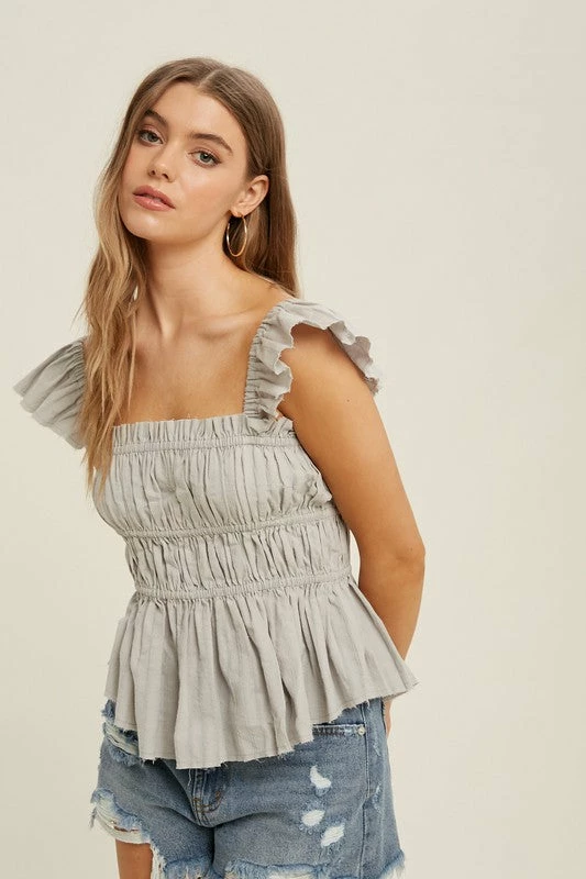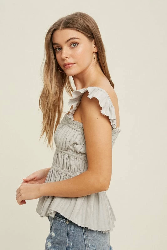 The Cindy Sea Blue Gathered Sleeveless Ruffle Top.