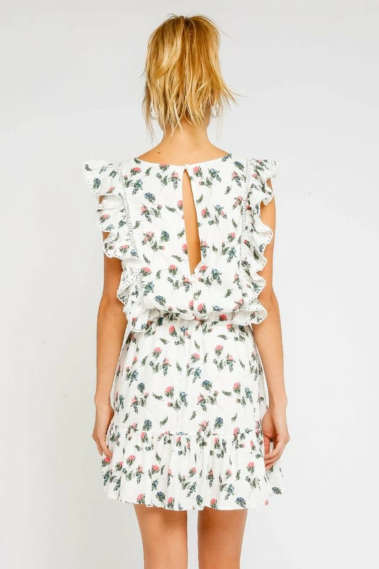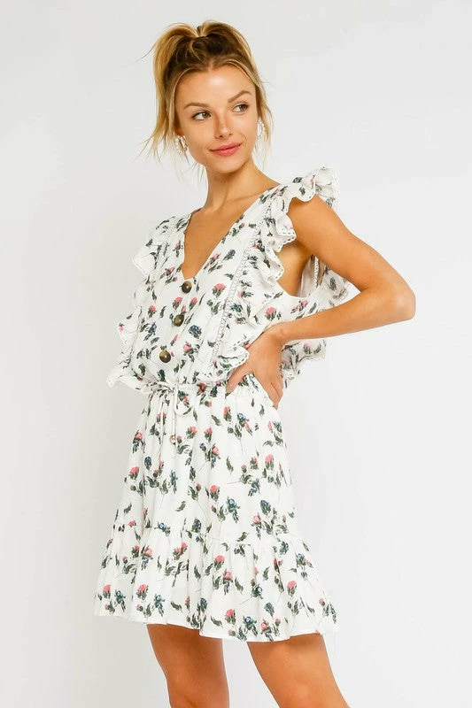 Our Floral Button Up Dress features ruffled sleeves and an open back.