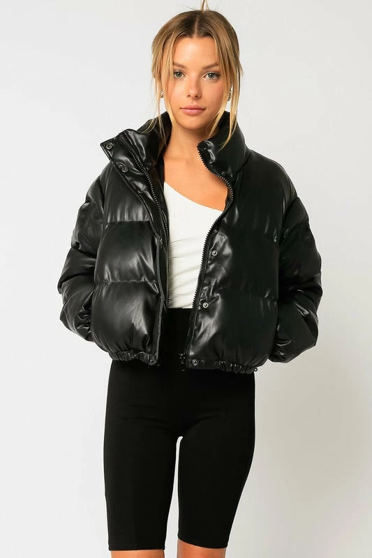 Our Faux Leather Puffer Jacket features a zipper front and pockets. Woven. Model's Measurements: Height 5'7 | Bust 32 | Waist 24 | Hips 34 | Size S